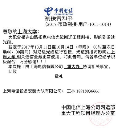 接中国电信光缆割接通知,兹定于2017年10月11日至10月14日(每晚0:00时至次日晨06:00期间)对沿途光缆进行割接,光缆割接将影响上海大学相关通信业务正常使用,届时将会对校园网络造成影响,特此告知!