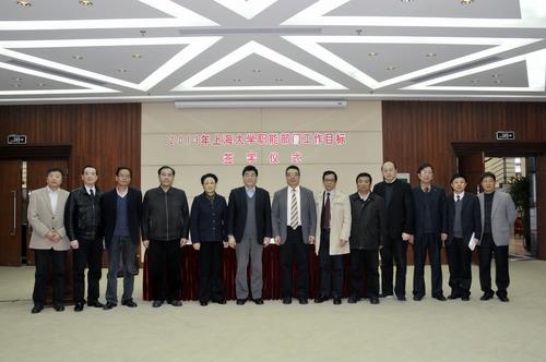 3月29日,2013年上海大学职能部门工作目标签字仪式在上海大学国际会议中心举行, 这标志着上海大学职能部门全系统质量管理正式启动。党委书记于信汇、校长罗宏杰、首批参加职能部门工作目标管理工作的科技处、人事处、设备处、文科处、宣传部、研究生部分管校领导及部门负责人、以及组织部和学科办负责人参加了签字仪式。