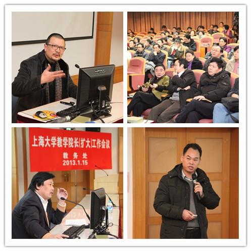 2013年1月15日上午,上海大学教学院长(扩大)工作会议在校本部J楼201室举行。叶志明副校长出席,教务处、考评办负责人、各学院本科教学院长、教学系主任、院系课程负责人、骨干教师共140余人参加。会议由教务处副处长顾晓英主持。会议的中心议题是交流后三年教学工作。