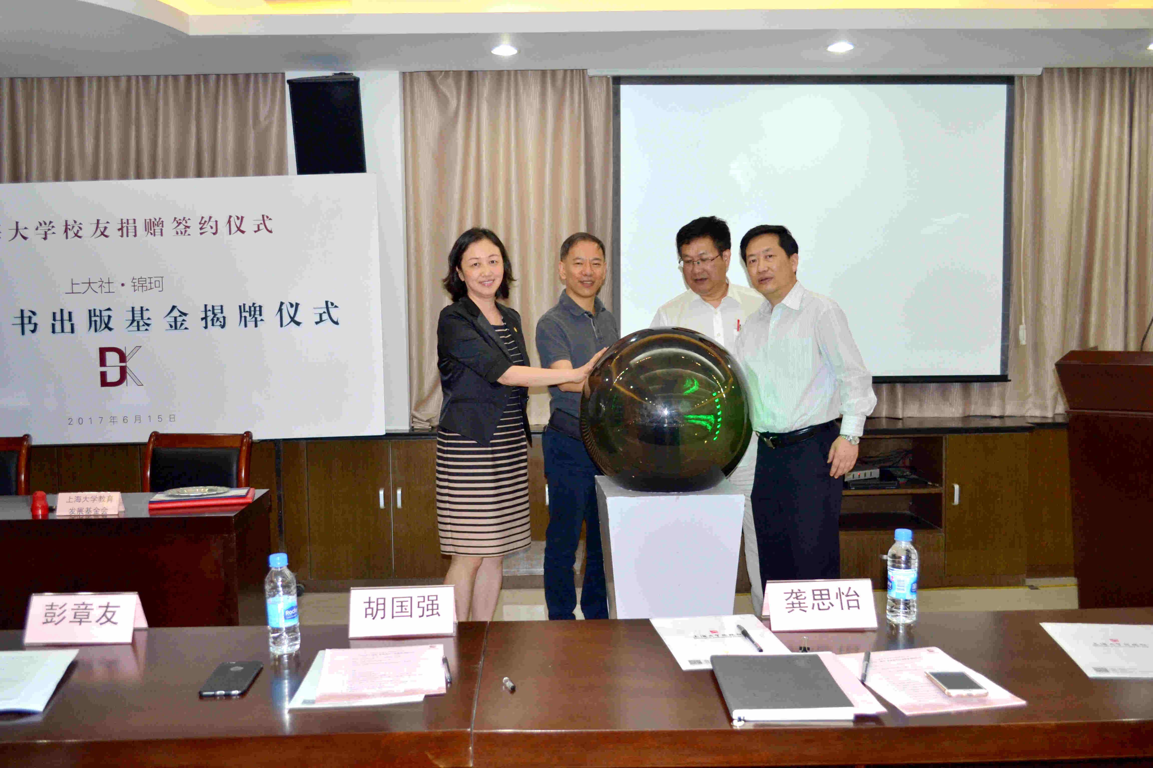 会上,学校教育发展基金会与上海锦珂塑胶科技有限公司签署了捐赠协议。龚思怡副书记向陈明华校友授予了捐赠证书和纪念牌,他们与戴骏豪社长、胡国强理事长一同为“上大社·锦珂优秀图书出版基金”揭牌。