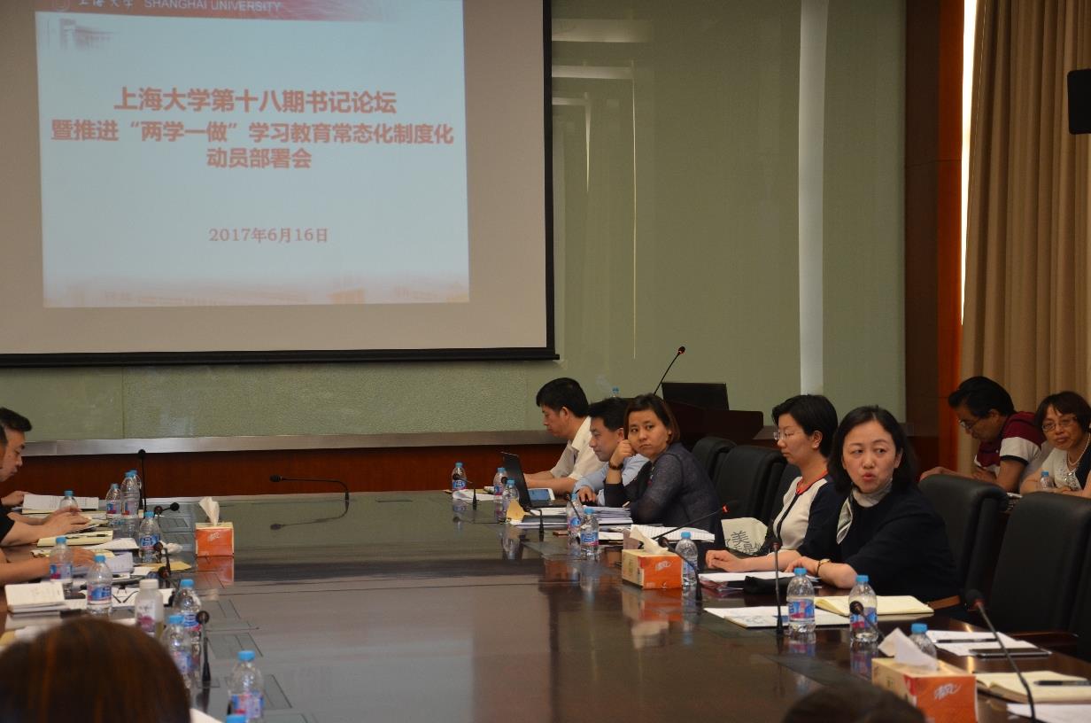 6月16日上午,上海大学第十八期书记论坛暨推进“两学一做”学习教育常态化制度化部署动员会在校本部碳碳大楼一楼会议室举行,市委组织部组织一处副处长戴涛做了“《上海市“两学一做”学习教育常态化制度化实施方案》解读”专题报告。校党委副书记、副校长龚思怡,各学院(系统)党委、直属党总支书记以及党务部门领导应邀出席了论坛。论坛由组织人事部副部长、组织部部长王军华主持。 首先,戴涛处长从制定方案的背景、意义、主要内容和具体要求等方面详细解读《上海市推动“两学一做”学习教育常态化制度化实施方案》。他结合国情、党情、市情深刻阐述推进“两学一做”学习教育常态化制度化的重大意义;系统解析了推进“两学一做”学习教育常态化制度化的重点内容和目标要求。整个报告主题鲜明、内涵深刻、史料翔实、生动形象,使大家深受教育和启发。 会上,校党委副书记、副校长龚思怡代表学校党委对推进“两学一做”学习教育常态化制度化进行动员部署。她强调推进“两学一做”学习教育常态化制度化,要抓住带根本性方向性全局性的问题,明确目标任务,准确把握科学内涵和具体要求,紧密联系学校工作实际,在抓长、抓细、抓常上下功夫、求实效。第一,要坚持“学”是基础。全体党员要深学、细学党章党规和习近平总书记系列重要讲话精神,尤其要系统学习、深刻领会、全面把握习近平总书记对上海工作和对高校思想政治工作的重要指示要求,并将之作为各项工作的根本遵循,做到真学真懂真信真用,切实增强贯彻落实的自觉性、坚定性。第二,要把握“做”是关键。党员领导干部、教师党员、学生党员都要把政治合格放在首位,把执行纪律合格作为铁的要求,把品德合格作为重中之重,把发挥作用合格作为检验言行的重要标尺,始终发挥共产党员先锋模范作用。第三,要坚持“干”是核心。把学习成果转化为工作的能力、发展的动力,更好地推动学校高水平大学建设,党员干部不仅要自己干好,还要发挥好“关键少数”带动绝大多数的示范效应。第四,要始终聚焦基层。牢固树立党的一切工作到支部的鲜明导向,注重把思想政治工作落到支部,把从严教育管理党员落到支部,把群众工作落到支部,建强支部,做好支部工作,使支部真正成为团结群众的核心、教育党员的学校、攻坚克难的堡垒。第五,要坚持问题导向。党员领导干部、教师党员、学生党员和学校各级党组织要把查找解决问题作为规定要求,建立完善及时发现和解决问题的有效机制。 她希望在座的各位书记能强化担当精神和进取意识,切实履行岗位职责;加强学习,努力提升综合能力,更好地驾驭全局、办学治院;切实改进作风,自觉践行“三严三实”和“四讲四有”,扎扎实实推进各项工作,不折不扣完成好各项工作,为加快推进学校高水平大学建设而努力奋斗。 |
