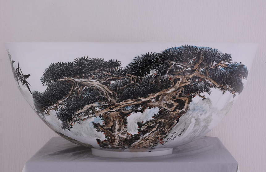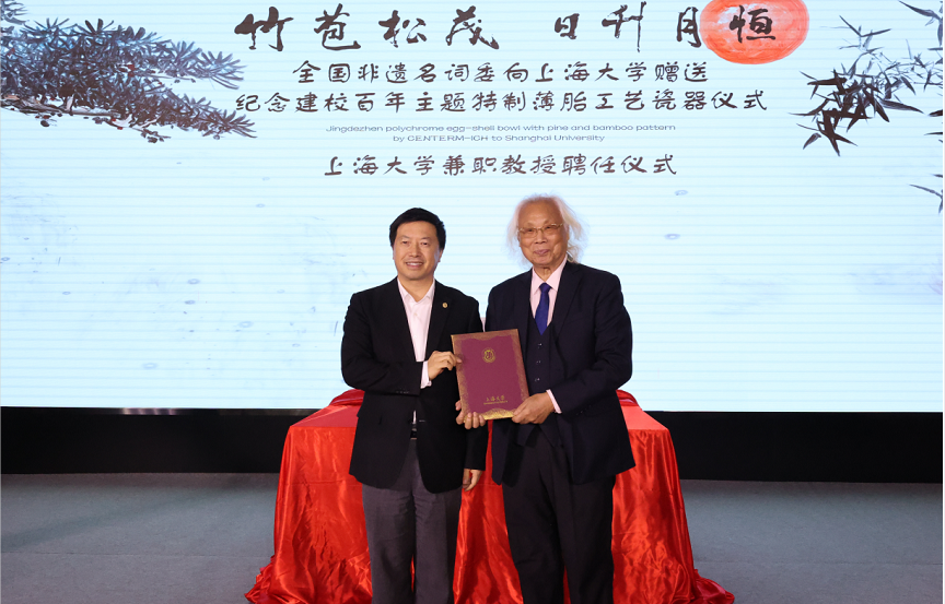 项兆伦先生和刘魁立先生代表委员会向上海大学赠送了为庆祝上海大学建校百年特制的景德镇窑新彩松竹纹薄胎大碗,成旦红书记和刘昌胜校长代表上海大学共同为贺礼揭幕。在上海大学迎来建校百年之际,全国非物质文化遗产名词审定委员会精心策划,由上海大学美院章莉莉教授和文信学院张睿锜副教授等设计,由2003年首届中国陶瓷艺术大师陆如先生和2022年第八届中国工艺美术大师陆岩先生绘制,由景德镇有40余年烧制经验的景德镇著名制瓷大师卢建德先生及其徒弟张睿锜副教授等烧制完成,为上海大学倾力奉献了这件景德镇窑特制薄胎大碗。该工艺大碗直径100厘米,寓意上海大学建校百年,胎薄0.35厘米,大器薄胎,烧制难度极高。碗面绘制苍松翠竹、海水江崖、日月同辉,书写“竹苞松茂,日升月恒”八字主题,既是对上海大学百年光辉历程的礼赞,也是对上大未来发展的祝愿。具有十分丰富的内涵和很高的科技、工艺、美学价值。该工艺大碗将入藏上海大学博物馆。
