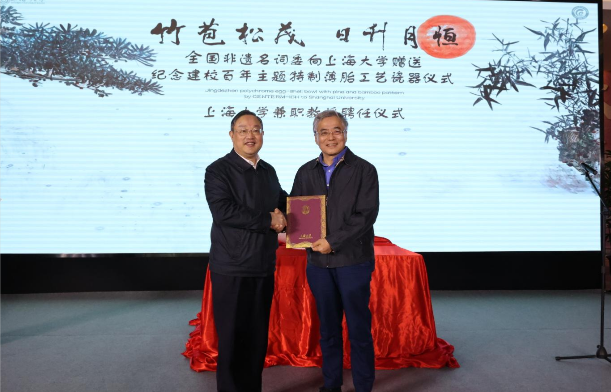 10月11日下午,全国非物质文化遗产名词审定委员会(以下简称“全国非遗名词委”)向上海大学赠送纪念建校百年主题特制工艺瓷器,及聘任项兆伦先生和刘魁立先生为上海大学兼职教授仪式举行。文化和旅游部原副部长和党组成员、全国非遗名词委顾问项兆伦,中国社会科学院荣誉学部委员、全国非遗名词委顾问刘魁立,上海大学党委书记成旦红,上海大学党委副书记、校长刘昌胜,上海大学党委副书记、全国非遗名词委主任段勇,上海大学上海美术学院原院长汪大伟,上海大学上海美术学院副院长、上海市公共艺术协同创新中心主任金江波,全国非遗名词委秘书长、上海大学文学院教授黄景春,中国民俗学会副秘书长李春园,全国非遗名词委副秘书长、上海大学上海美术学院教授章莉莉等出席了赠送仪式。赠送仪式由段勇主任主持。