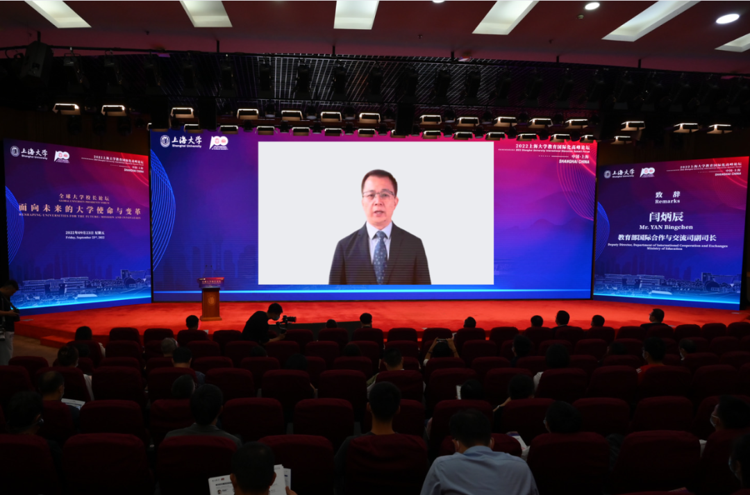 教育部国际合作与交流司副司长闫炳辰以视频的方式致辞。闫炳辰向长期以来支持、推动中国教育对外开放事业的朋友们表示衷心的感谢。他提出,在目前新冠与百年变局交织之下,世界高等教育面临新的挑战和机遇。上海大学值此建校百年之际,邀请全球大学校长共同探讨面向未来的大学使命和变革发展之路,具有重要的意义。