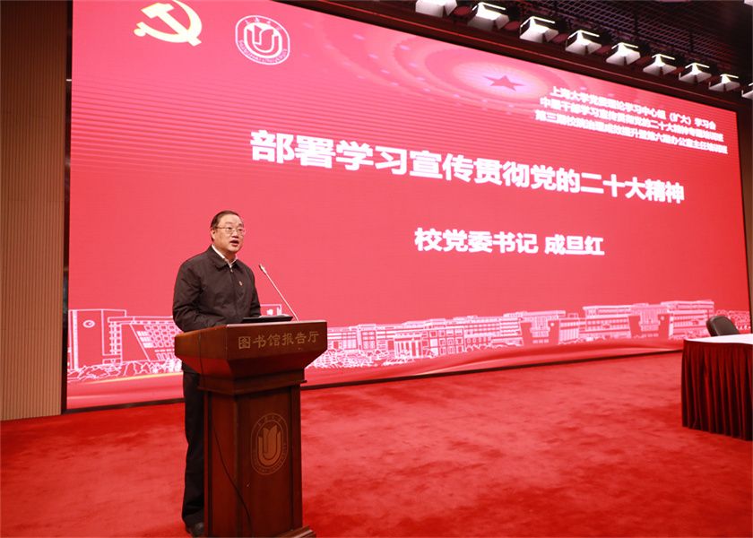 成旦红指出,学习宣传贯彻党的二十大精神要做到政治站位高、学习方向准、学习举措实、组织保障强;要坚持对标对表,通过学习培训、理论宣讲、新闻宣传、研究阐释、文艺创作等举措,团结广大党员干部、师生群众,贯彻落实好党的二十大提出的各项具体工作要求。以党的二十大提出的重大任务为指引,研究形成推动学校“双一流”建设的新思路、新举措,切实把习近平新时代中国特色社会主义思想和党的二十大精神贯彻落实到学校教育、科技、人才的各项事业发展之中,形成凝心聚力开创上海大学下一个百年辉煌的强大合力。