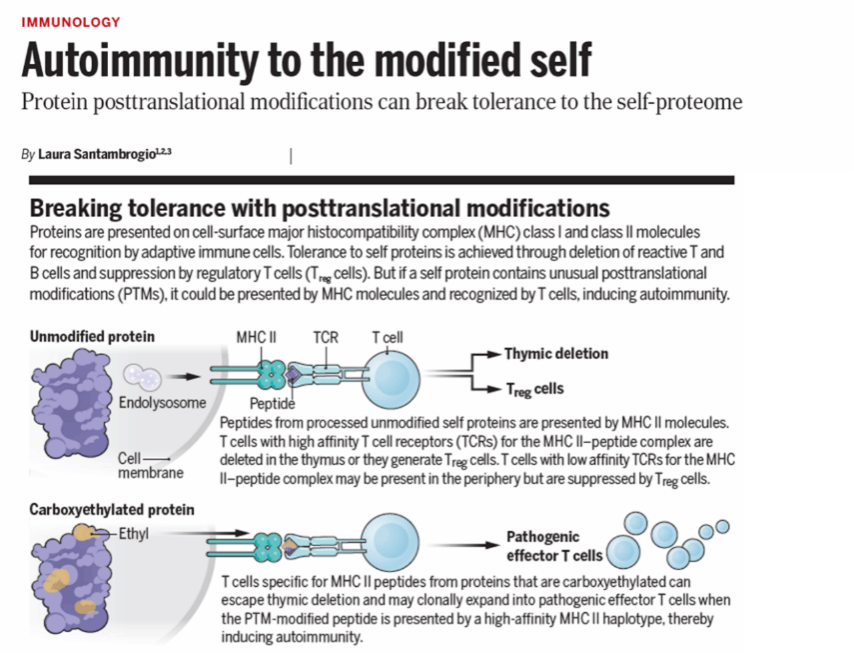 同期,Science杂志还发表了一篇专门评述文章:Autoimmunity to the modified self。该评论特别指出,大量研究已经发现翻译后修饰在炎症和代谢过程中被广泛监测到,自身蛋白PTM是自身免疫的重要来源。随着技术的不断进步和研究的深入,有望发现更多的诱导自身免疫反应的PTM。