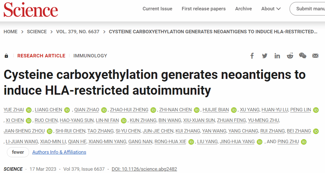 2023年3月17日,医学院陈亮教授与空军军医大学朱平教授、郑州大学杨静华教授合作,以共同通讯作者在国际顶级学术期刊《Science》上发表题为“Cysteine carboxyethylation generates neoantigens to induce HLA-restricted autoimmunity”的研究论文。上海大学为论文的共同通讯单位、第二完成单位。