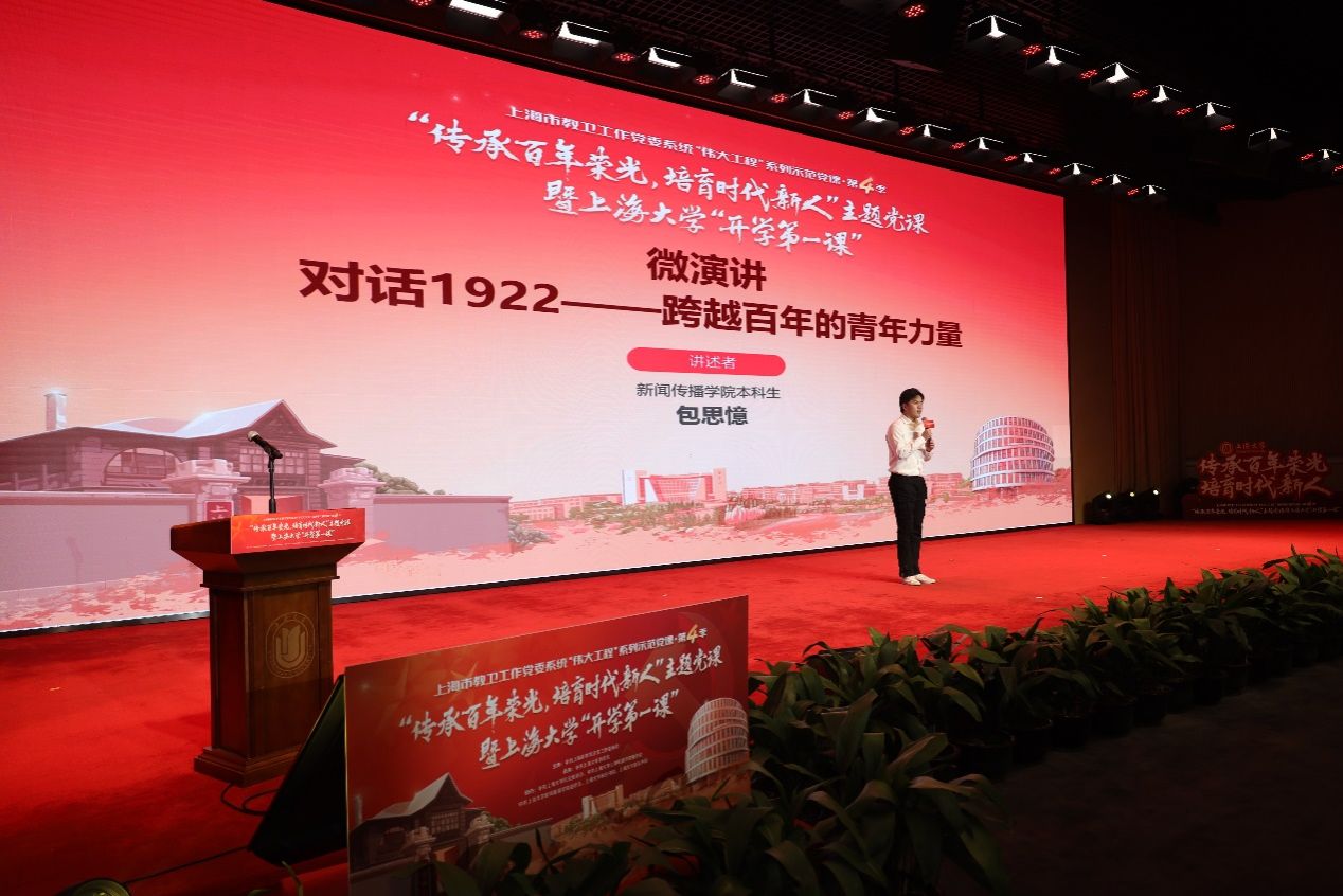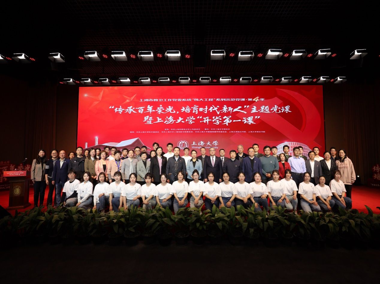 3月30日下午,上海市教卫工作党委系统“伟大工程”系列示范党课(第四季)“传承百年荣光 培育时代新人”主题党课暨上海大学“开学第一课”在宝山校区图书馆报告厅顺利举行。市教卫工作党委组干处副处长朱晨光,校党委书记成旦红,校党委副书记、校长刘昌胜,校领导吴明红、王从春、汪小帆、沈艺及400余位师生共同参加此次党课活动。上海大学教务部副部长顾晓英主持串讲。