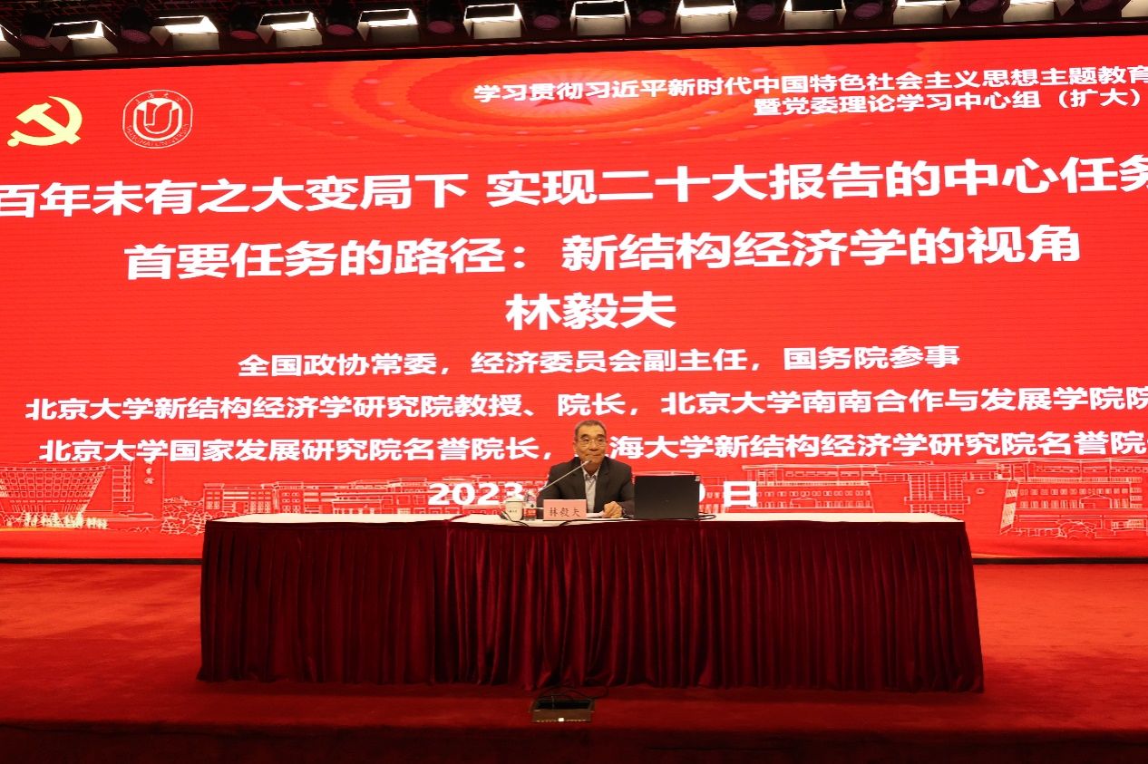 6月9日,上海大学党委举办主题教育读书班第九讲暨党委中心组(扩大)学习会,邀请著名经济学家林毅夫教授作《百年未有之大变局下实现二十大报告的中心任务和首要任务的路径:新结构经济学的视角》辅导报告。校领导班子成员、全校各单位中层干部现场参加学习。学习会由校党委常委、副校长王从春主持。
