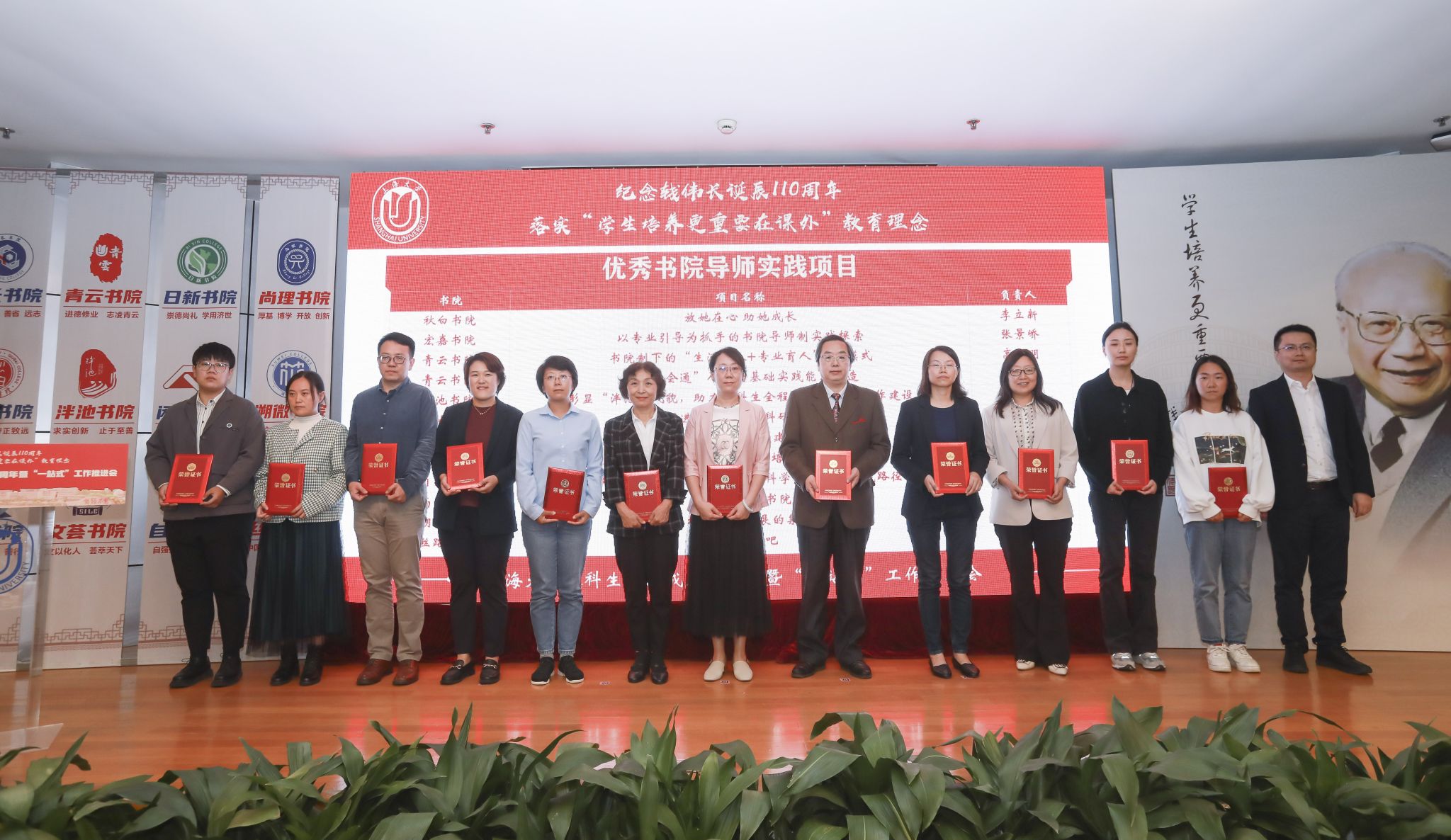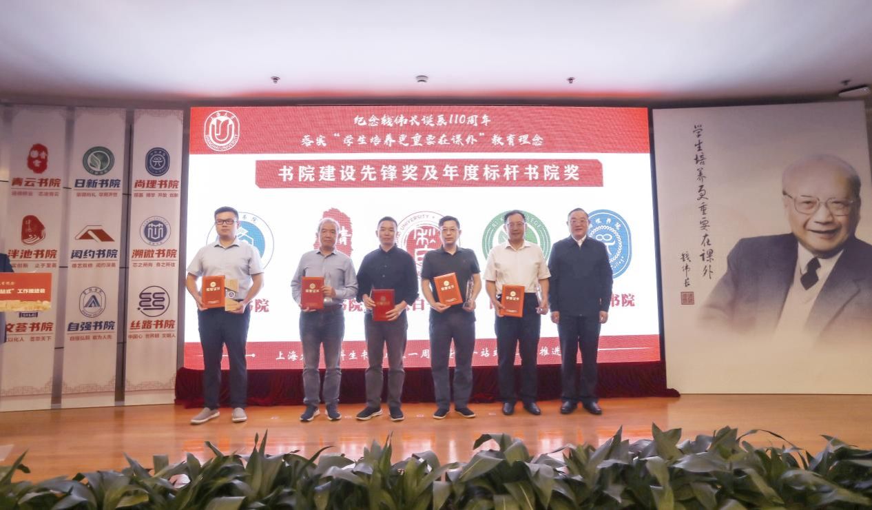 成旦红书记为书院建设先锋奖获得者伟长书院院长周全,2022-2023年度书院建设标杆书院获得者青云书院院长陶飞亚、秋白书院院长肖瑛、日新书院院长钟云波、尚理书院院长盛万成5家书院颁奖。