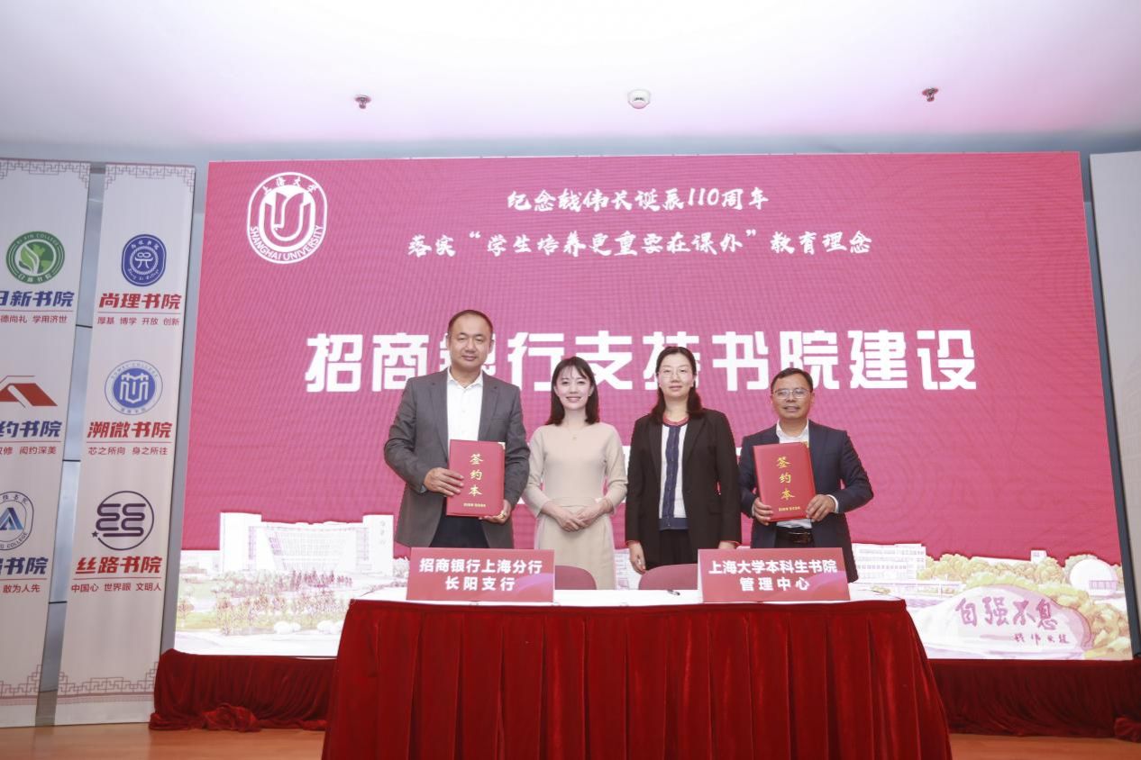 上海大学本科生书院建设得到了社会各界的热切关注,招商银行上海分行长阳支行与本科生书院管理中心签署共建协议。双方将在书院信息化、书院文化和美育教育等方面展开深度合作。招商银行上海分行长阳支行综合区域支行行长王鹏宇与学工办主任、武装部部长、本科生书院管理中心主任孟祥栋签约,招商银行上海分行零售银行部总经理励蒂与组织人事部常务副部长、组织处处长沈艺共同见证。