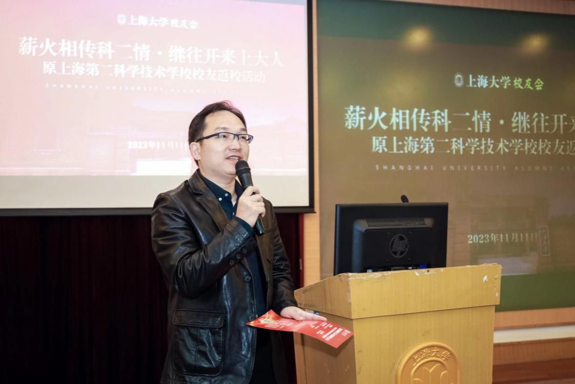 对外联络处处长、校友会秘书长陈然致欢迎辞。他代表母校校友会,欢迎广大“科二”校友返校相聚,并简要介绍了校友会的基本情况和“科二”与上大的渊源。他指出,上海大学的欣欣向荣,离不开我们35万校友的血脉相连与代代传承,校友会将一如既往、全力以赴做好服务工作,欢迎大家常回“家”看看。