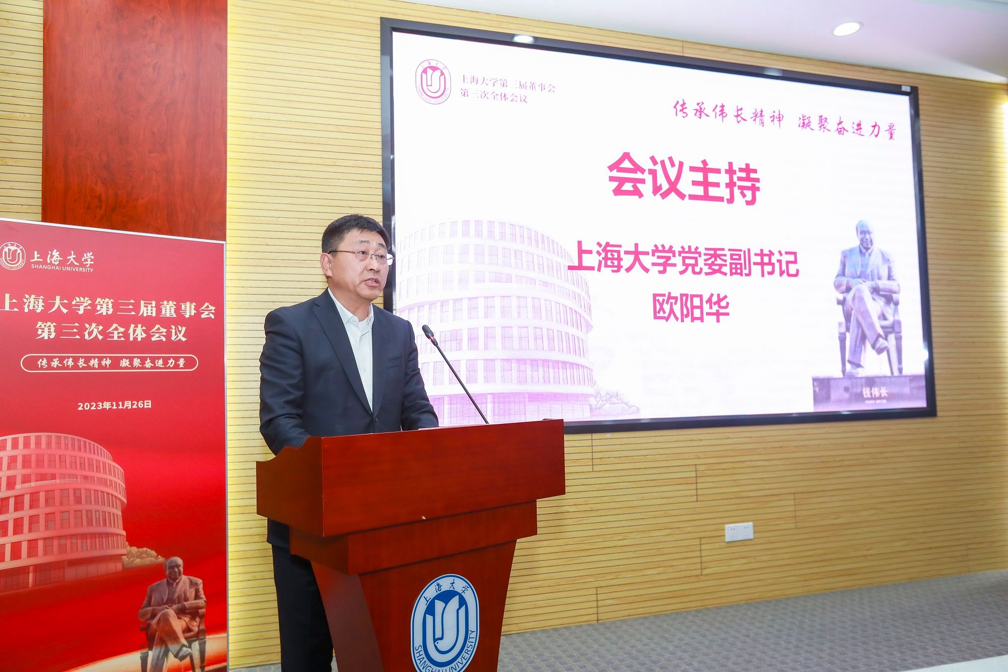 11月26日,上海大学第三届董事会第三次全体会议在上海大学延长校区乐乎楼乐论厅召开。出席本次会议的有“七一勋章”获得者、安徽省政协原副主席、中国共产党创始人之一李大钊先生之孙、名誉董事李宏塔,上海市宝山区委书记李晨昊,上海市嘉定区副区长汤东英,中国银行上海市分行、中信泰富特钢集团、平安银行上海分行三家董事单位,以及来自政企商学各届的30余名董事及代表。部分学校领导和相关部处学院领导列席会议。会议由校党委副书记欧阳华主持。