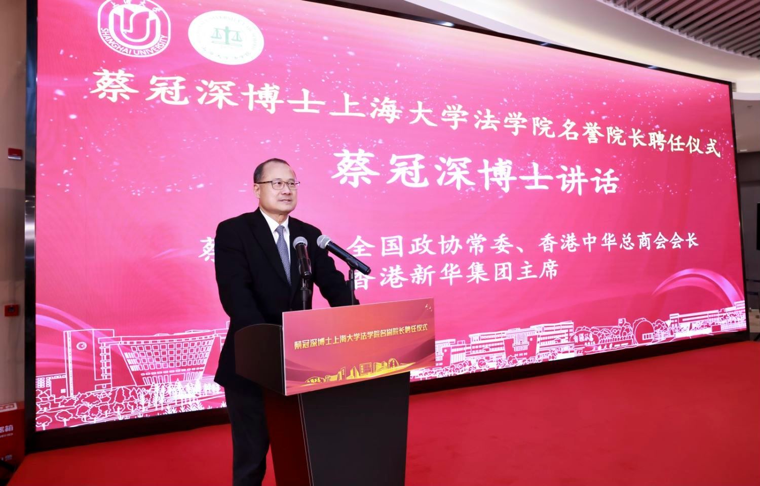 刘校长指出,蔡冠深博士近四十年倾情奉献于科教文化公益事业,先后创办多个教育基金,捐建多个科技教育机构、文化设施等,成就斐然、影响巨大。1997年,蔡冠深博士捐资设立上海大学蔡冠深教育奖励基金,开启了与上海大学的深厚情谊。蔡冠深博士与钱伟长校长亦相识相交长达十余年,结下了深厚友谊。目前,蔡冠深博士已是连续三届的上海大学名誉董事,上海大学蔡冠深讲堂、蔡冠深国际远程艺术交流中心等设施持续支撑保障着学校师生的教学科研,上海大学蔡冠深优秀青年教师奖和研究生特种奖学金也持续激励上大师生努力追卓越、创一流。今天蔡冠深博士受聘担任上海大学法学院名誉院长,是对上海大学事业发展的最新支持,必将成为推动上海大学法学院快速发展的又一重要机遇!