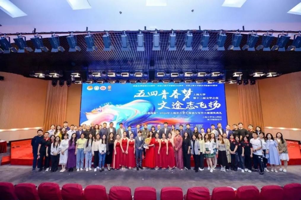 为了纪念“五四运动”105周年、纪念上海大学建校102周年、庆祝上海大学新合并组建30周年,2024年5月10日,“五四青春梦 文途志飞扬”上海大学第十二届“文学之夜”暨“启典阅新”2024年上海市大学生阅读与写作大赛颁奖典礼在上海大学图书馆报告厅举行。校党委副书记段勇,党委副书记、副校长胡大伟,党委常委、副校长聂清,党委常委、宣传部部长曾军;上海市教委教材和语言文字管理处处长陈爱平、上海思亮信息技术股份有限公司代表胡圣迪、中国建设银行股份有限公司上海第五支行行长俞晓露;上海交通大学、上海外国语大学等兄弟高校代表;党委研工部、学生工作办公室、校团委、研究生院、教务部、国际部、校工会妇委、招生就业处、对外联络处、图书馆等部处领导;合作单位代表、中小学师生代表、企业代表、媒体记者、校友代表以及线上线下观众共同见证了这场文学盛宴。