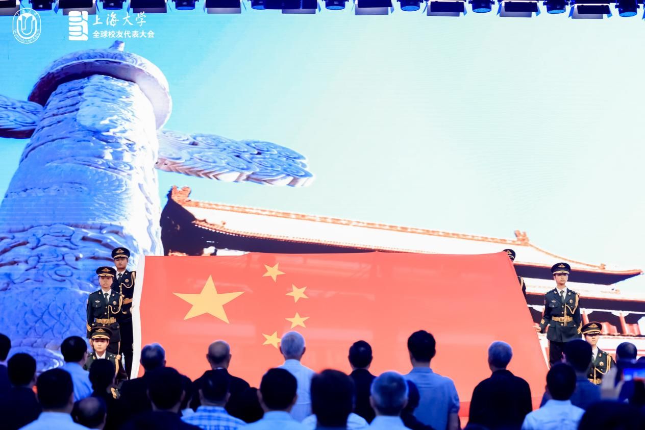 大会在庄严的迎国旗、唱国歌仪式中拉开帷幕。这面由天安门地区管委会赠予上海大学的国旗曾在2021年学校建校99周年之际,于天安门广场上高高飘扬,它不仅象征着国家的尊严和荣耀,更承载着上海大学师生的深厚情感和崇高敬意。