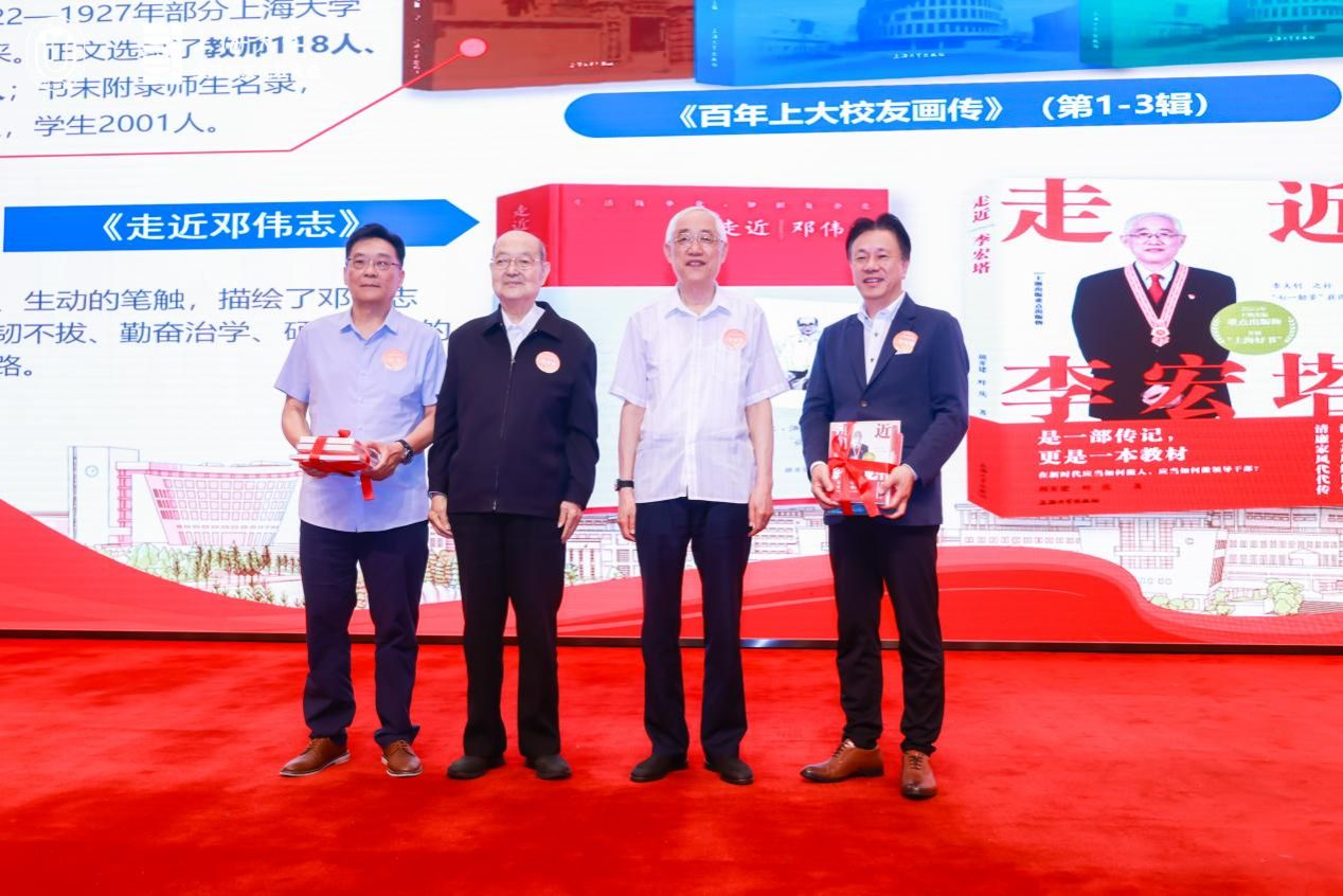 “红色学府·百年上大”全球校友组织接力传承仪式上,《走近李宏塔》《走近邓伟志》两本书籍的主人公李宏塔主席、邓伟志教授为全球校友组织代表赠书。上海大学四川校友会会长张志、日本校友会会长柴国强作为代表接受赠书。