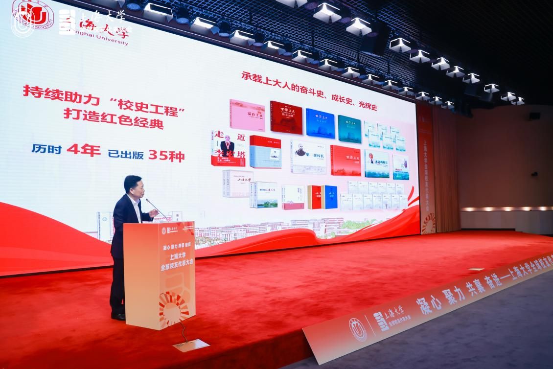 上海大学出版社社长戴骏豪作“百年上大人”精品出版工程介绍。他向大家介绍了近年来学校出版社推出的《百年上大 校友画传》等承载着上海大学百年育人成果和文化基因的精品书籍,并诚邀全球校友一同加入挖掘校史资料、讲述校友故事的行列,与母校形成合力、共铸荣光。