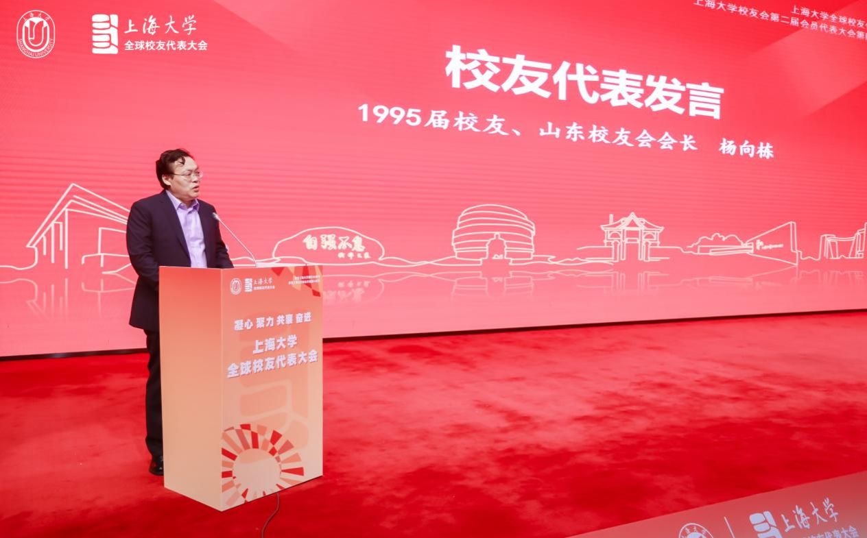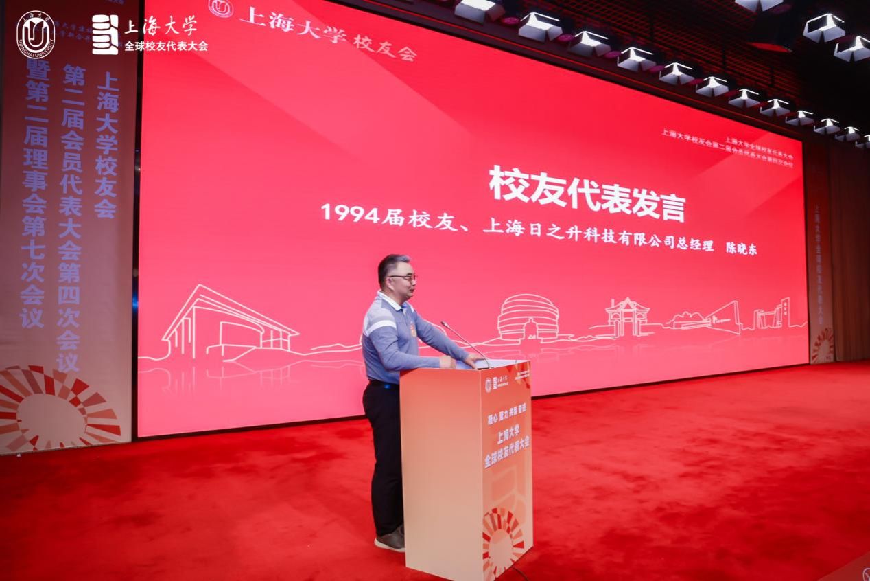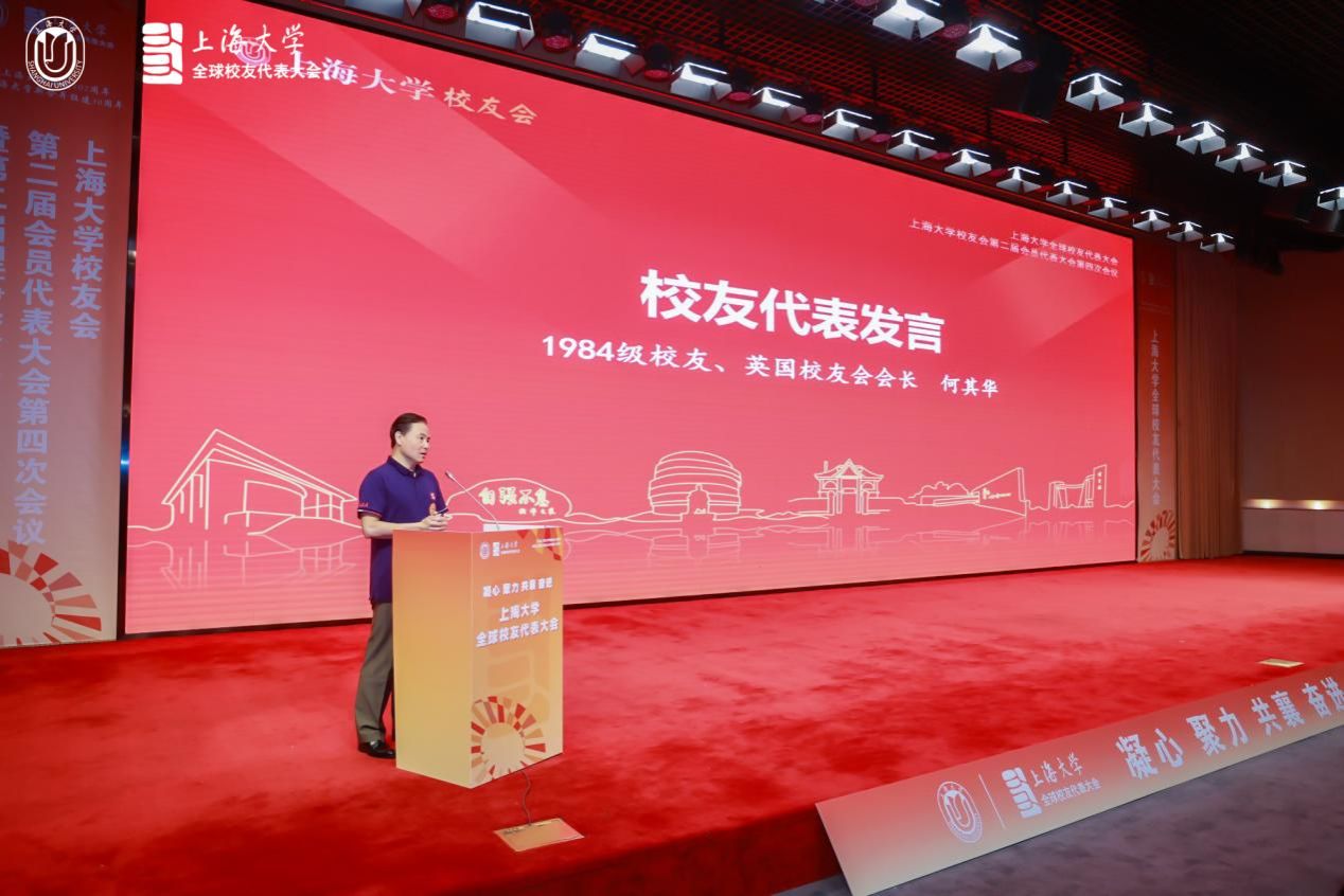 校友代表发言环节,1984级校友、英国校友会会长何其华,1995届校友、山东校友会会长杨向栋,1994届校友、上海日之升科技有限公司总经理陈晓东,2023届外籍校友孟清扬,以及2024届毕业生代表章叶浩薇先后进行发言,分享了他们与母校的感人故事和对母校的深厚情感。