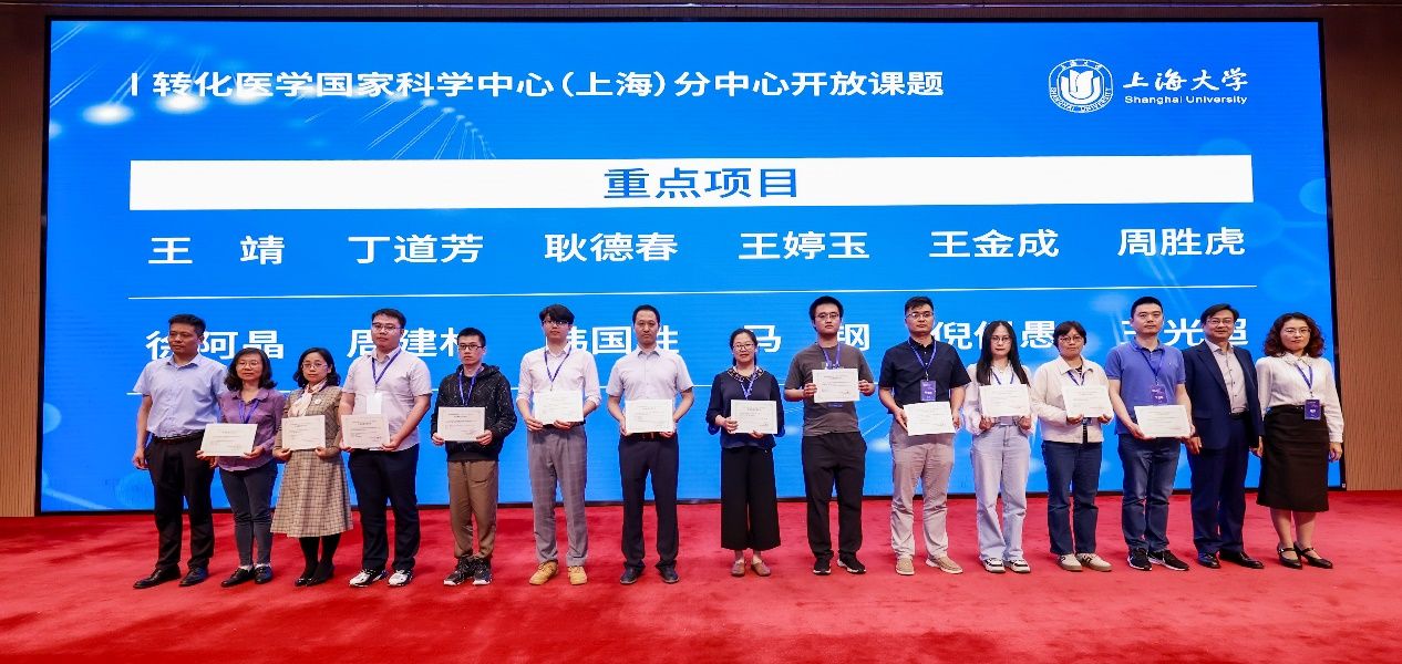 上海大学高等研究院执行院长邵玮、医学院院长刘斌与生科院党委书记陈付学为转化医学国家科学中心(上海)上大分中心开放课题颁发获批证书