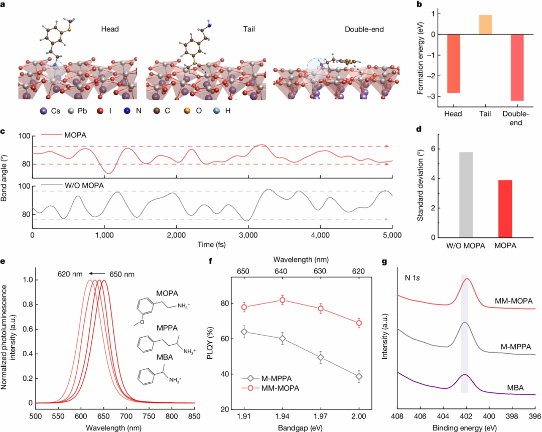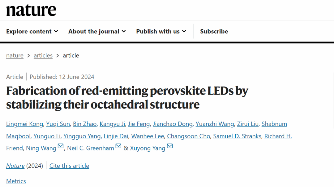 2024年6月12日,上海大学机电工程与自动化学院新显教育部重点实验室杨绪勇教授研究团队与合作单位团队关于“稳定钙钛矿八面体实现高效红光LED”最新研究成果,以Fabrication of red-emitting perovskite LEDs by stabilizing their octahedral structure为题在国际顶尖期刊Nature上发表。论文链接:https://www.nature.com/articles/s41586-024-07531-9