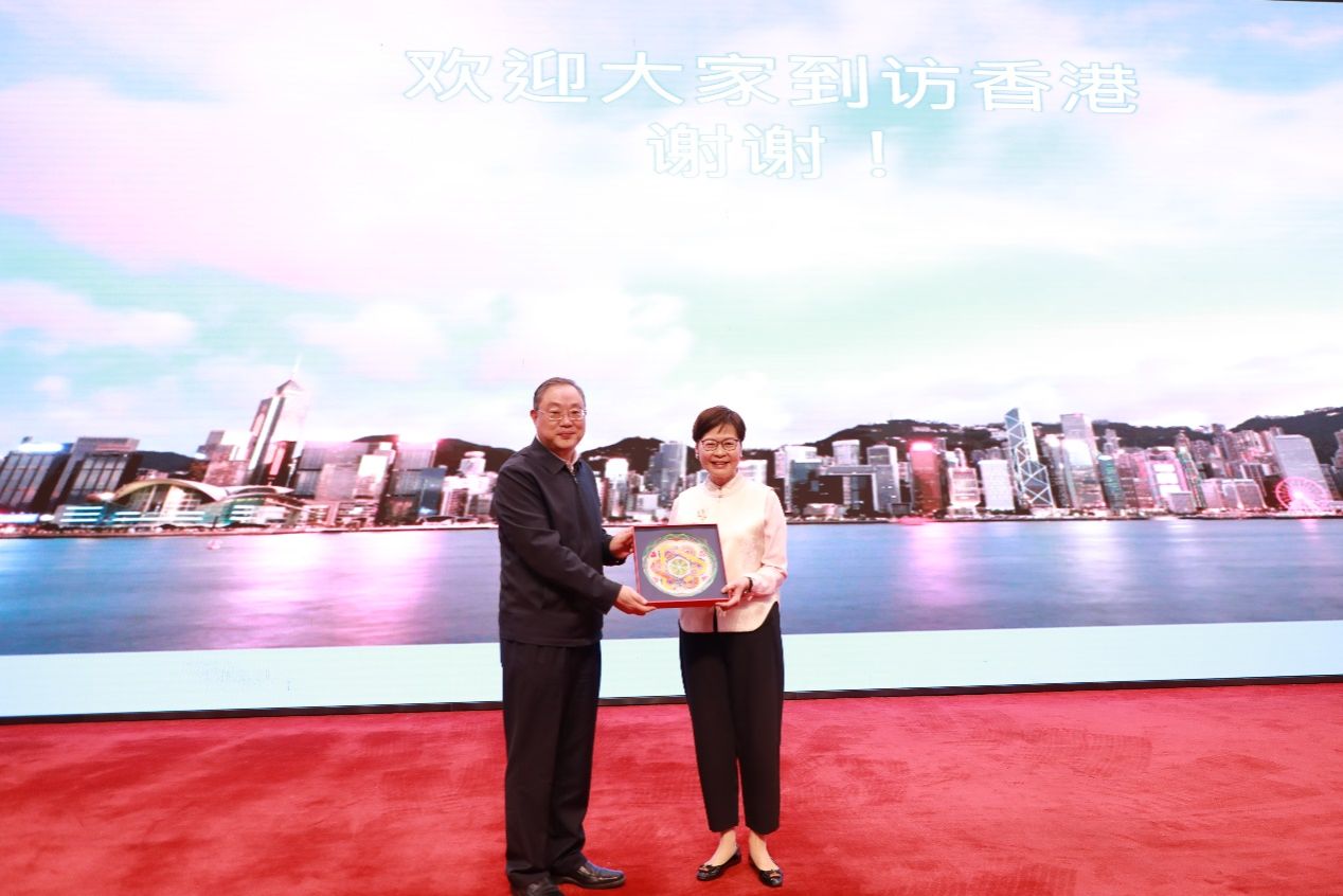 成旦红代表学校向林郑月娥女士赠送了由上海大学上海美术学院师生设计制作的龙年定制非遗雕版印刷技艺彩盘,其中双龙咬尾的造型寓意文化和谐共生、融洽无间,永续发展、相融相生,迸发出无穷的创造力。