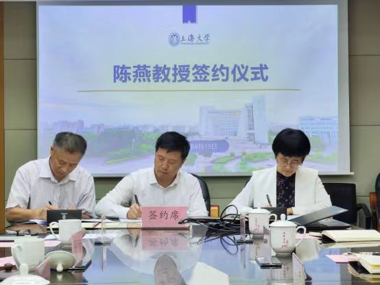 刘昌胜校长为陈燕教授颁发上海大学特聘教授和知识产权学院战略发展委员会主任聘书。