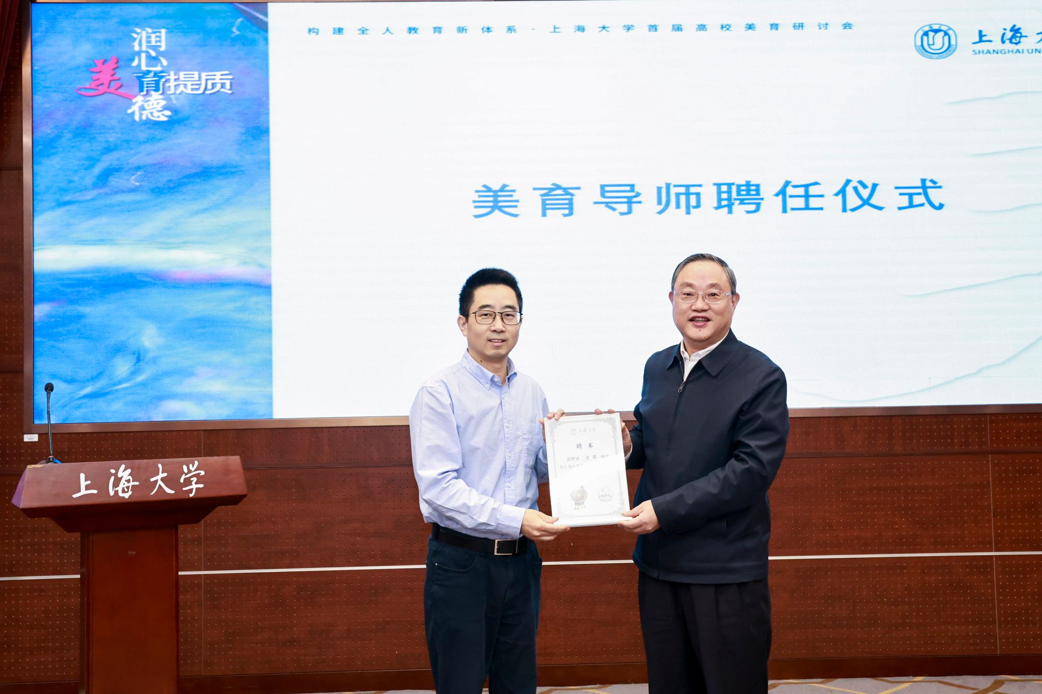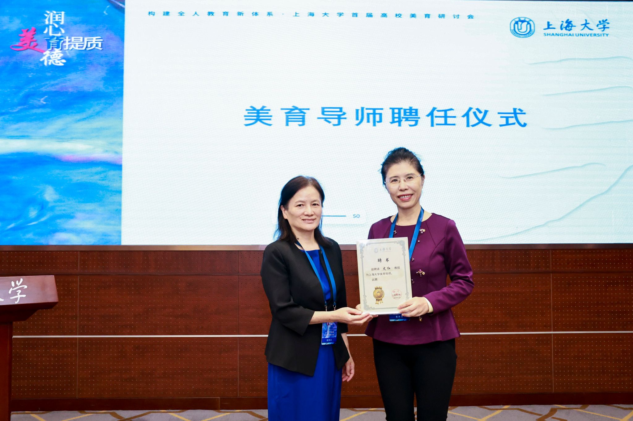 在开幕式上,浙江音乐学院副院长、教授汪洋,首都师范大学艺术与美育研究院教授、教育部全国美育教学指导委员会委员史红受聘为上海大学美育导师。