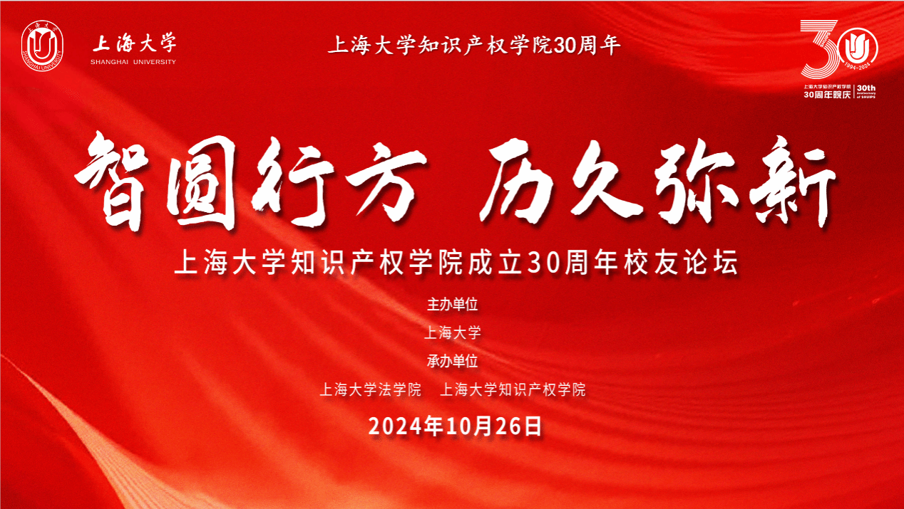 三十而立,向新而行。10月26日,由上海大学主办,上海大学法学院、知识产权学院承办的“智圆行方 历久弥新——上海大学知识产权学院成立30周年校友论坛”在宝山校区图书馆报告厅举办。本次论坛通过回顾历史、展望未来,深入剖析知识产权教育领域的演进趋势与未来方向,共绘知产学院未来发展的美好蓝图。上海大学党委书记成旦红,中国知识产权研究会副理事长、上海市知识产权研究会理事长单晓光,上海大学知识产权学院名誉院长陶鑫良,上海知识产权法院原审判委员会专职委员陈惠珍和上海市政协常委、首届“东方大律师”、上海市协力律师事务所创始人游闽键等领导和嘉宾出席论坛。