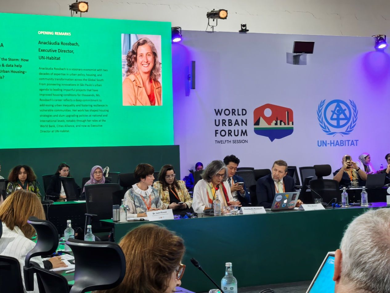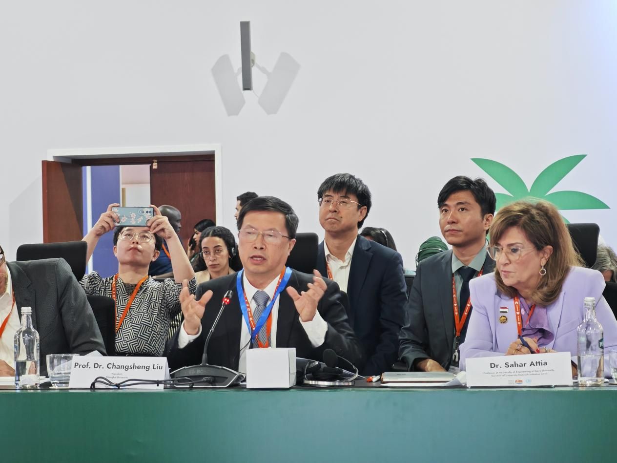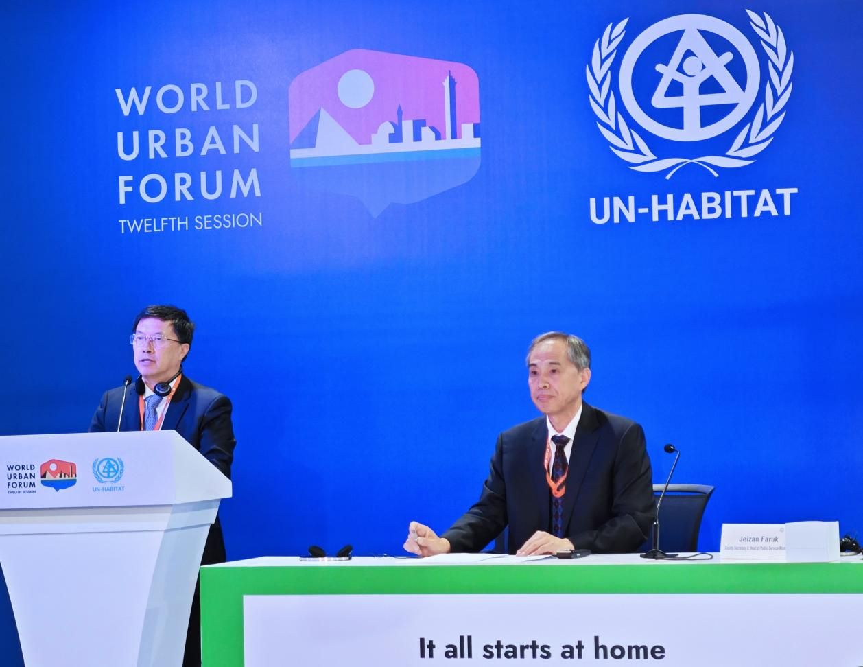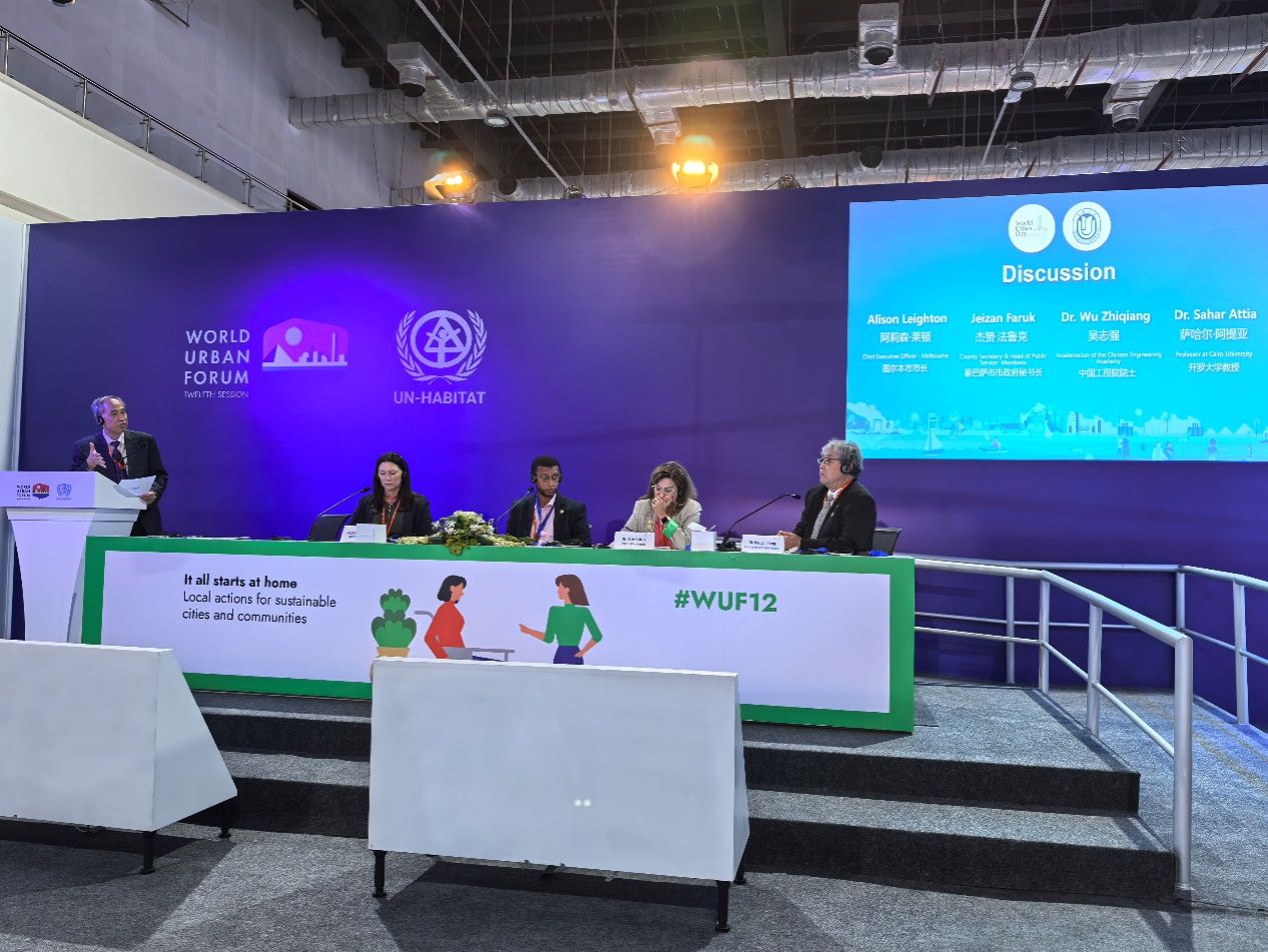 11月8日,刘昌胜校长一行在埃及开罗国际展览中心1号馆出席第十二届世界城市论坛“风暴之眼”(In the Eye of the Storm)学术界圆桌会议。联合国副秘书长兼人居署执行主任阿纳克劳迪娅·罗斯巴赫(Anacláudia Rossbach)、埃及高等教育和科研部部长艾曼·阿舒尔(Ayman Ashour)出席会议并致辞。人居署全球大学联盟共同主席布鲁斯·斯蒂夫特(Bruce Stiftel)和萨哈尔·阿提亚(Sahar Attia)教授主持会议。