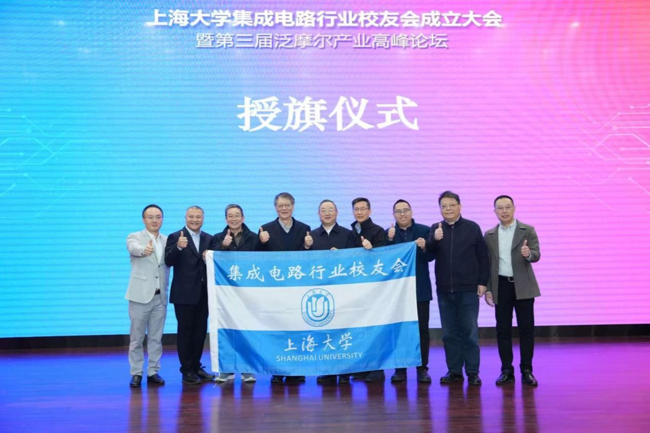 成立大会上,上海大学党委书记、上海大学校友会会长成旦红为上海大学集成电路行业校友会授旗,由新当选的上海大学集成电路行业校友会会长、副会长、秘书长共同接旗。