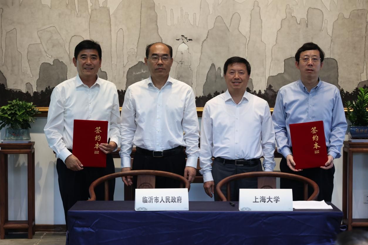 段勇、王相恩分别代表上海大学与临沂市政府签订战略合作备忘录,刘昌胜、毕黎明共同上前见证。
