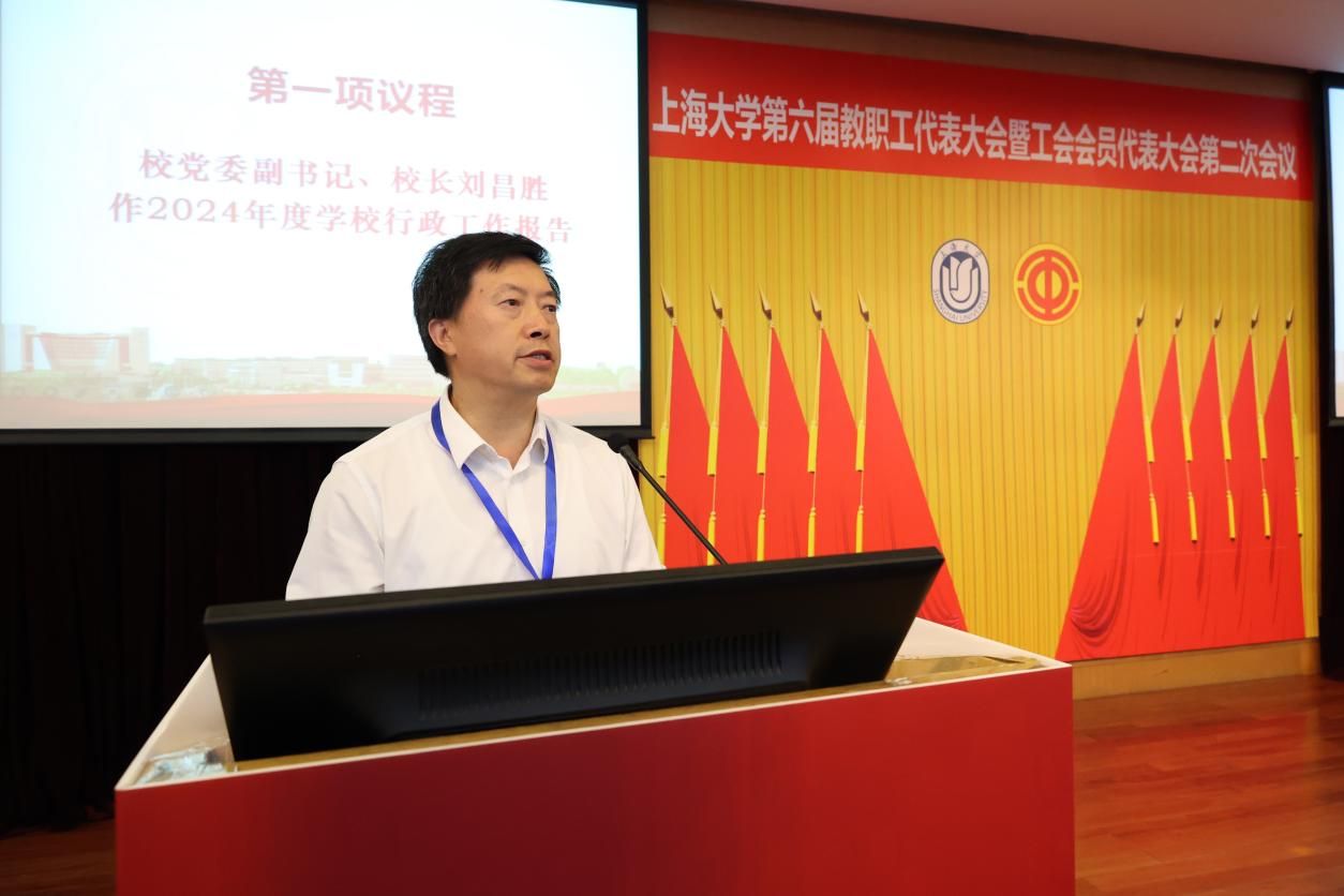 校党委副书记、校长刘昌胜代表学校向大会作了题为《勇当改革先锋 奋楫创新浪潮 在服务教育强国建设中彰显上大特色》的行政工作报告。