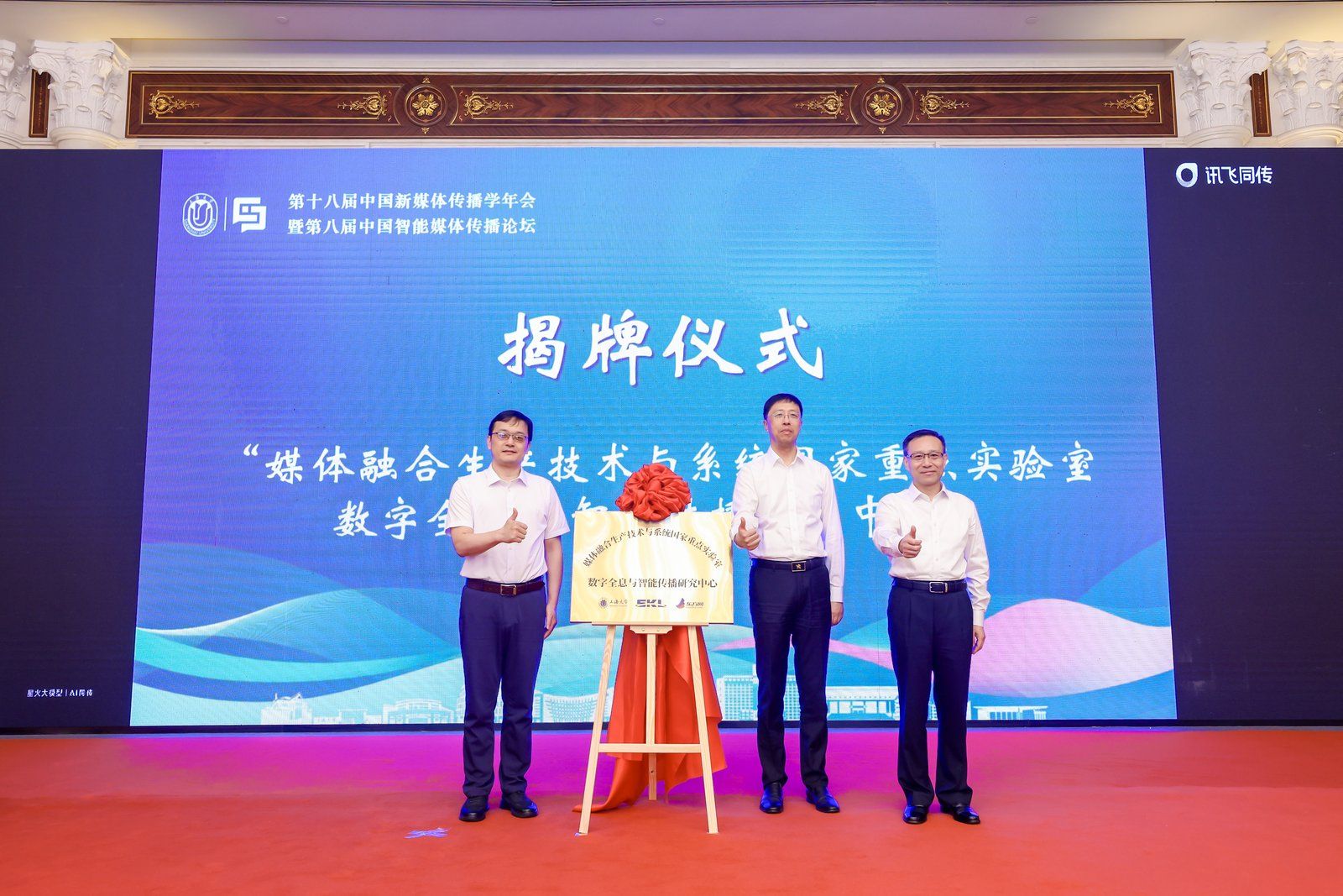 上海大学新闻传播学院自2018年就确定了“智能传播”这一战略发展方向,致力于以高水平科研平台建设拉动科研、教学和团队建设。开幕式上,学院与新华社国家重点实验室、东方网共同建立“媒体融合生产技术与系统国家重点实验室数字全息与智能传播研究中心”,在上海大学党委书记吴坚勇见证下,新华社国家重点实验室副主任钟昊熹,上海报业集团党委副书记、总经理、副社长胡明华共同为研究中心揭牌。