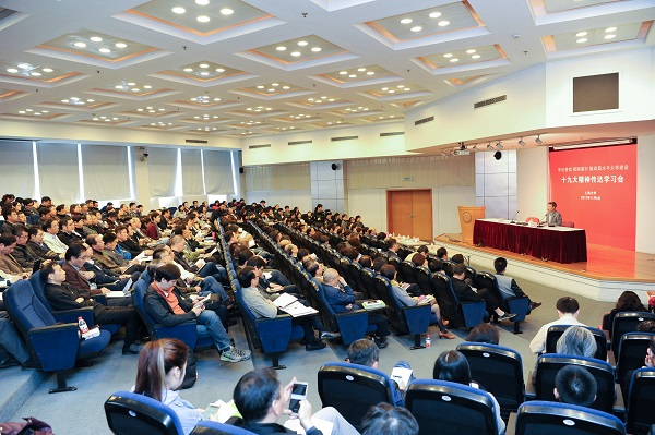 11月6日下午,我校2017年第七次全校校院两级中心组学习报告会在行政楼报告厅举行。校党委书记、校长金东寒院士作为十九大代表全程参加了党的十九大各项会议的议程,并再次当选中国共产党第十九届中央委员会候补委员。为落实中央及上海学习贯彻十九大精神的要求,金东寒书记面向学校师生做“牢记使命、砥砺前行,推动高水平大学建设——十九大精神传达学习”专题辅导报告,报告会由校党委副书记龚思怡主持,全校校院两级中心组成员,副处及以上干部,各民主党派代表、教师代表和学生代表近300人一同聆听了本场报告会。