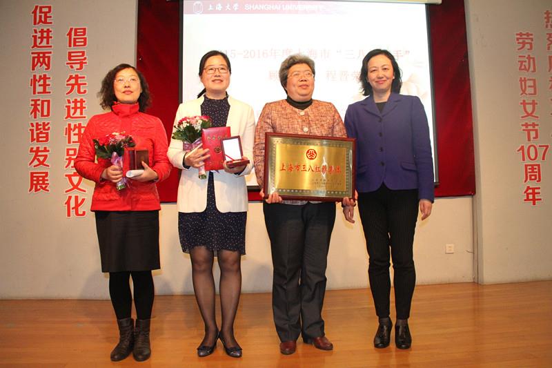 大会表彰了上海市三八红旗手2人、上海市三八红旗集体1个、上海市教育系统三八红旗手2人、上海市教育系统三八红旗集体1个、上海大学三八红旗手25人、上海大学三八红旗集体5个、上海大学优秀妇女工作者8人和先进妇女之家6个。荣获上海市三八红旗手的教务处副处长顾晓英研究员、上海市教育系统三八红旗集体机自学院无人艇总体室主任谢少荣教授接受大会采访,分别讲述了她们的成功经验和体会。荣获上海市三八红旗集体的离退休工作处陆群英处长代表获奖集体发言,让现场观众领略了一个热心为退休老同志服务的女性团队的责任担当和巾帼风采。荣获上海市教育系统三八红旗手的管理学院许科老师,更是强调了作为一个女教师对课堂的热爱和对学生的关爱之情。