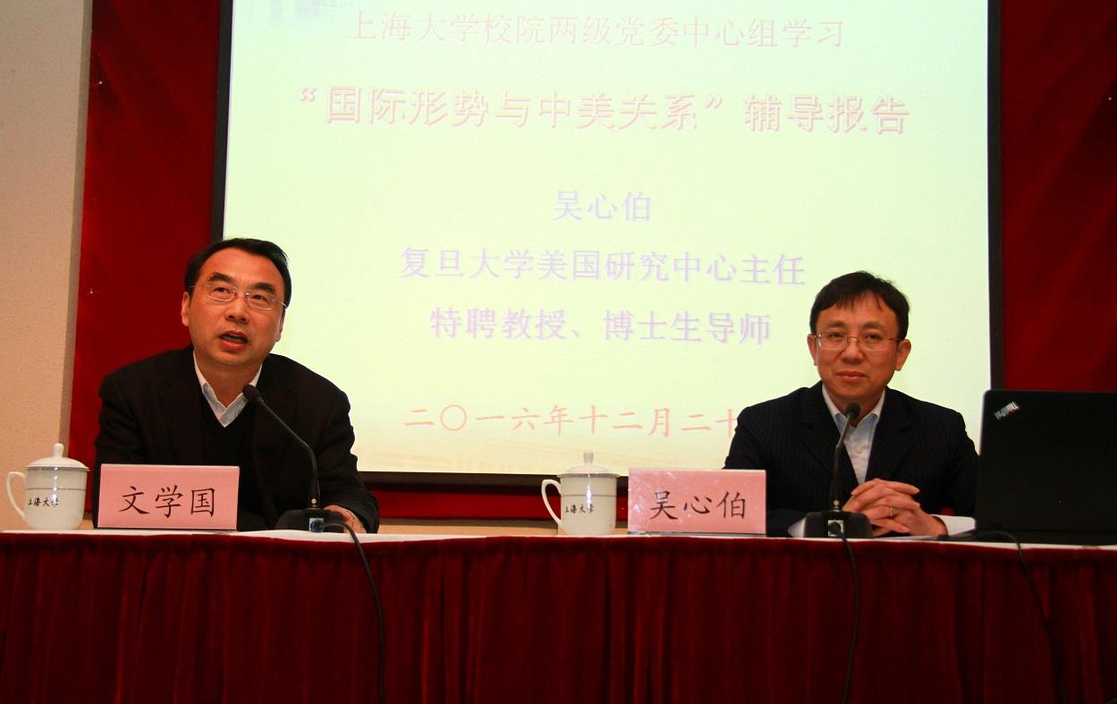 12月22日下午,复旦大学美国研究中心主任吴心伯教授来校作题为《国际形势与中美关系》的辅导报告。报告会由上海大学副校长文学国主持,校院两级中心组成员、副处级以上干部、人才学院学生代表和研究生代表聆听了此次报告。