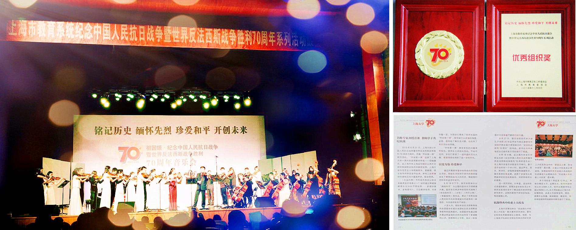12月10日晚,祖国颂·上海市教育系统纪念中国人民抗日战争暨世界反法西斯战争胜利70周年系列活动颁奖音乐会在我校伟长楼隆重举行。上海教育报刊总社党委书记彭东恺,中共教育卫生工作党委宣传处处长助理、网管中心副主任王力力以及来自上海12所高校和10个区县教育局的领导和老师出席活动并观摩了演出。本次音乐会由中共上海市教育卫生工作委员会、上海市教育委员会主办,上海大学、上海教育报刊总社承办。音乐会由我校音乐学院师生倾情献演,通过磨难、抗争、胜利和辉煌四个篇章,观众们在音乐中追忆峥嵘岁月,激发强烈的爱国情怀,由弦乐团演奏的《辛德勒的名单》和《我的祖国》更是使得现场观众热血沸腾。音乐会上,同时颁发了本市教育系统“纪念中国人民抗日战争暨世界反法西斯战争胜利70周年”系列活动优秀组织奖,我校凭借在活动中的优秀表现,获此荣誉。