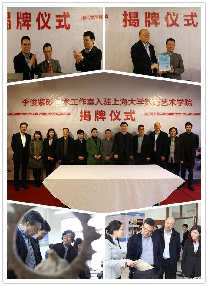 3月30日下午,李俊紫砂艺术工作室入驻上海大学数码艺术学院揭牌仪式在嘉定校区数码A楼216工作室成功举行。上海市文化广播影视管理局党委委员、副局长贝兆健,上海大学党委书记、校长罗宏杰,上海大学党委副书记、副校长徐旭,上海市文化广播影视管理局文化影视产业处处长黄玮,紫砂艺术大师李俊,书画大师谢稚柳之子谢定琨等30余位领导及业内外知名人士出席揭牌仪式。