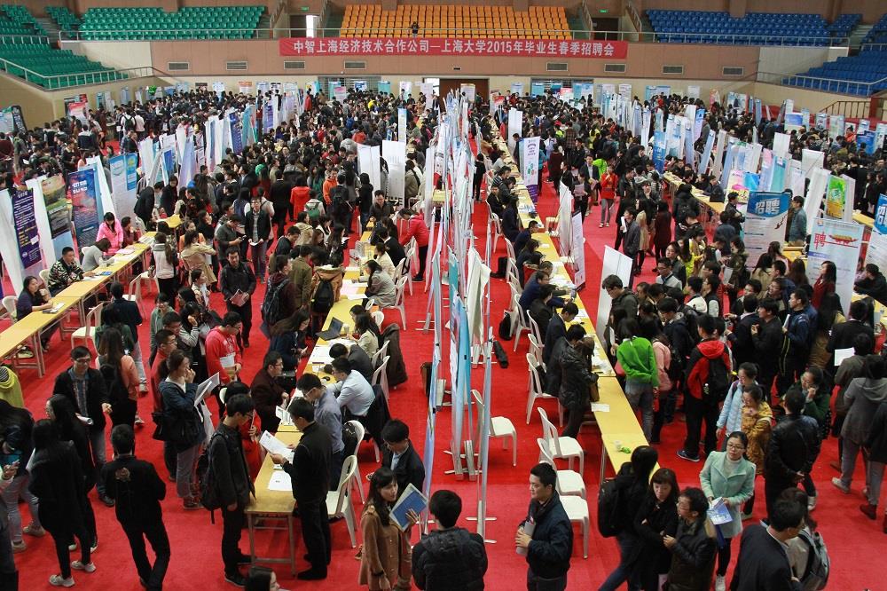 在春季毕业生离校和秋季毕业生就业的的关键期,2015年4月10日下午,中智上海经济技术合作公司——上海大学2015年毕业生春季招聘会在宝山校区体育馆举行。