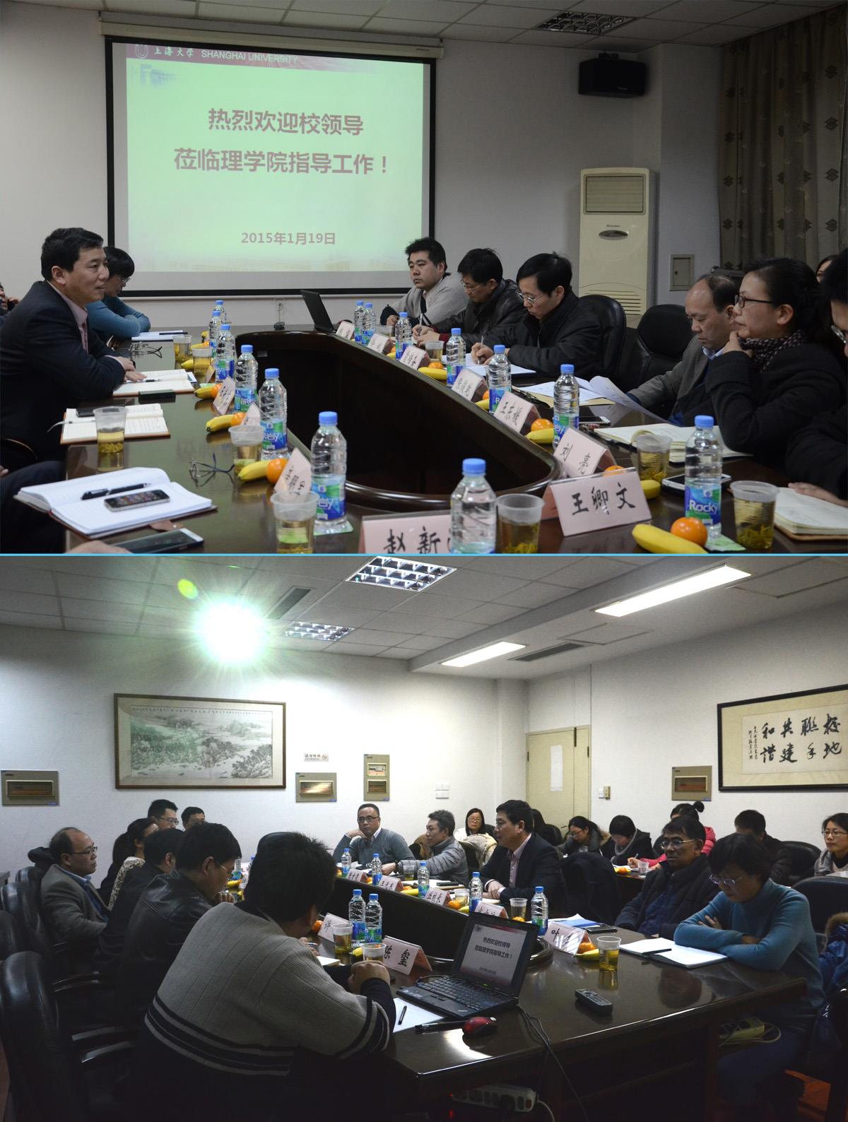 2015年1月19日下午2点,上海大学党委常委、副校长丛玉豪率相关部处一行到理学院调研本科教学和人才培养。教务处处长王光东、常务副处长陈方泉、招毕办主任叶红、考评办主任辛明军、原社区学院常务副院长宋少沪;以及校党委常委、理学院执行院长翁培奋、理学院党委副书记王东媛、刘亮、副院长陈玺、各系主任、教学副主任和教学管理团队出席了调研会。