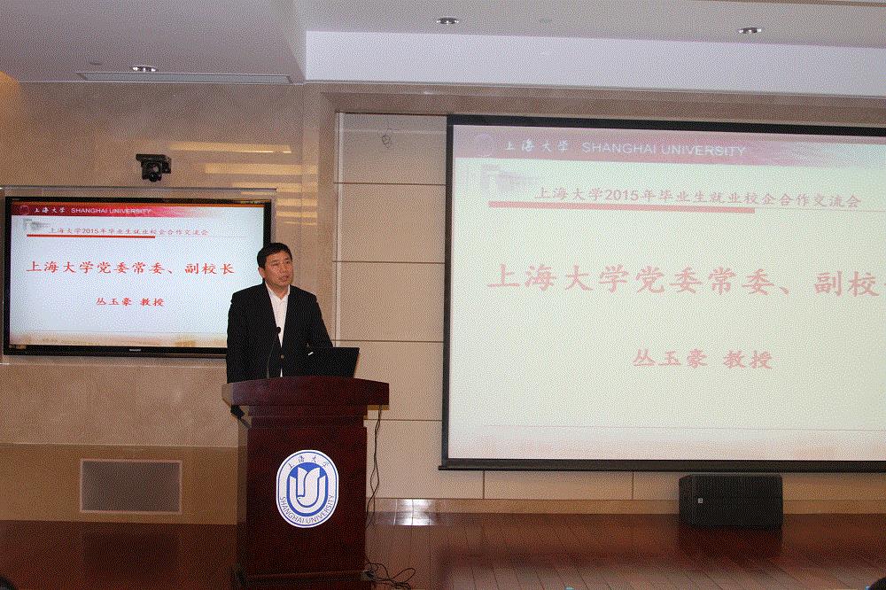2015年1月22日(周四)下午,上海大学2015年毕业生校企合作交流会在校本部乐乎新楼学海厅顺利召开。来自金融、制造、服务、通信等各行业的60多家用人单位的领导及人力资源部经理应邀参加了交流会。上海大学党委常委、副校长丛玉豪教授出席会议,校学工办、研究生工作部、团委、社区学院等相关部处领导和各学院就业专职教师列席会议。