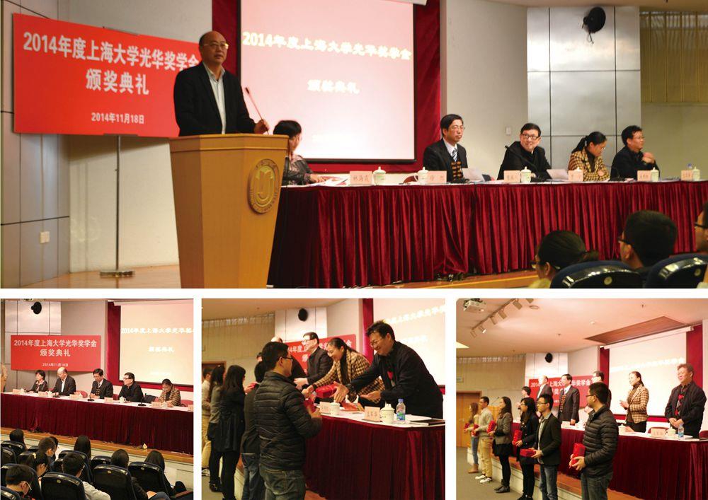 2014年11月18日下午,2014年度上海大学光华奖学金颁奖典礼在校本部行政楼报告厅举行。光华教育基金会代表陈振川先生,贾宁先生,上海大学党委常委、副校长、研究生院院长吴明红教授,上海大学党委常委、组织部部长徐旭教授,上海大学学工办主任王军华老师出席了本次颁奖典礼。参加本次颁奖典礼的还有获得2014年度上海大学光华奖学金的315名博士、硕士和本科生同学,颁奖典礼由学校光华奖学金秘书组负责人、校党委研究生工作部部长林海霞教授主持。