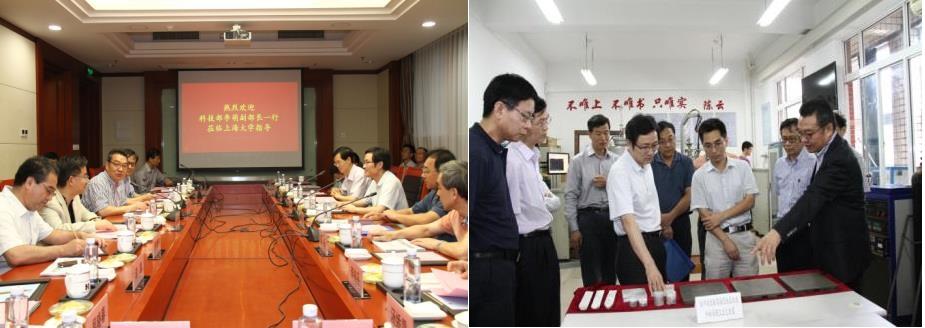 在汇报交流中,罗宏杰校长首先对于科技部和上海市科委多年来对上海大学的关心和支持表示衷心的感谢。材料学院任忠鸣教授就“高品质特殊钢冶金与材料加工省部共建国家重点实验室”筹建情况进行专题汇报。汇报主要围绕实验室建设背景和必要性、建设定位与研究方向、现有基础、预期目标及建设进度、建设体制机制保障五个方面展开。科技部及上海市科委领导认真听取了汇报,充分肯定国家重点实验室的筹备工作,一致认为目前该实验室学科历史悠久、人才基础很好,科研实力很强,总体具备了成为国家级科研基地的实力,同时也从区域和行业需求、研究方向设置及实验室体制机制创新等方面给出了许多重要的指导和建议。