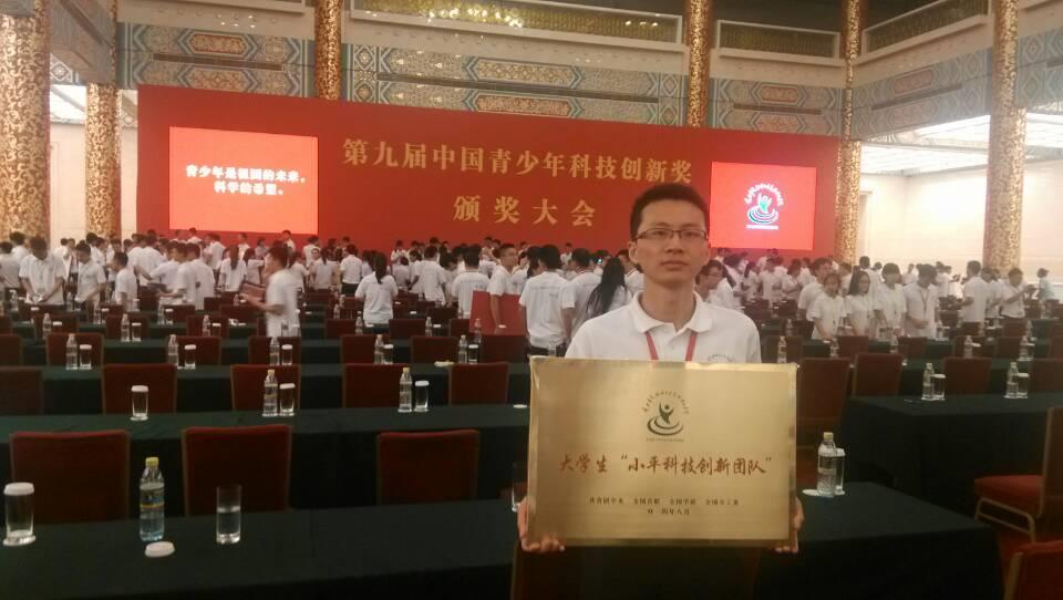 在邓小平同志诞辰110周年之际,第九届中国青少年科技创新奖颁奖大会在人民大会堂举行。我校理学院化学系李春举老师指导,汪一亮等同学主要负责的“柱芳烃超分子化学研究创新团队”获得了2014全国百个大学生“小平科技创新团队”(上海共5个),8月20日,马俊伟同学代表该团队代表前往北京领奖。