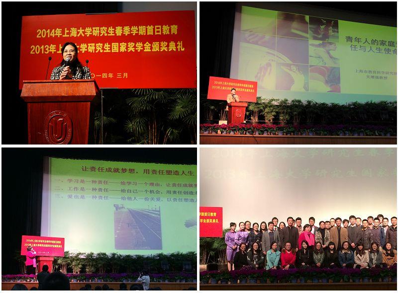 3月23日上午,以“荣耀与责任”为主题的2014年上海大学研究生首日教育暨2013年上海大学研究生国家奖学金颁奖典礼在宝山校区伟长楼隆重举行。副校长、研究生院常务副院长吴明红,校长助理、研究生工作党委书记、研究生院副院长李伟,研究生院副院长郭长刚,校团委书记胡大伟,研究生院培养管理处处长毛建华,研究生工作党委副书记凌长臣等,以及各学院研究生专兼职委员老师、2013级研究生们参加了此次教育活动。