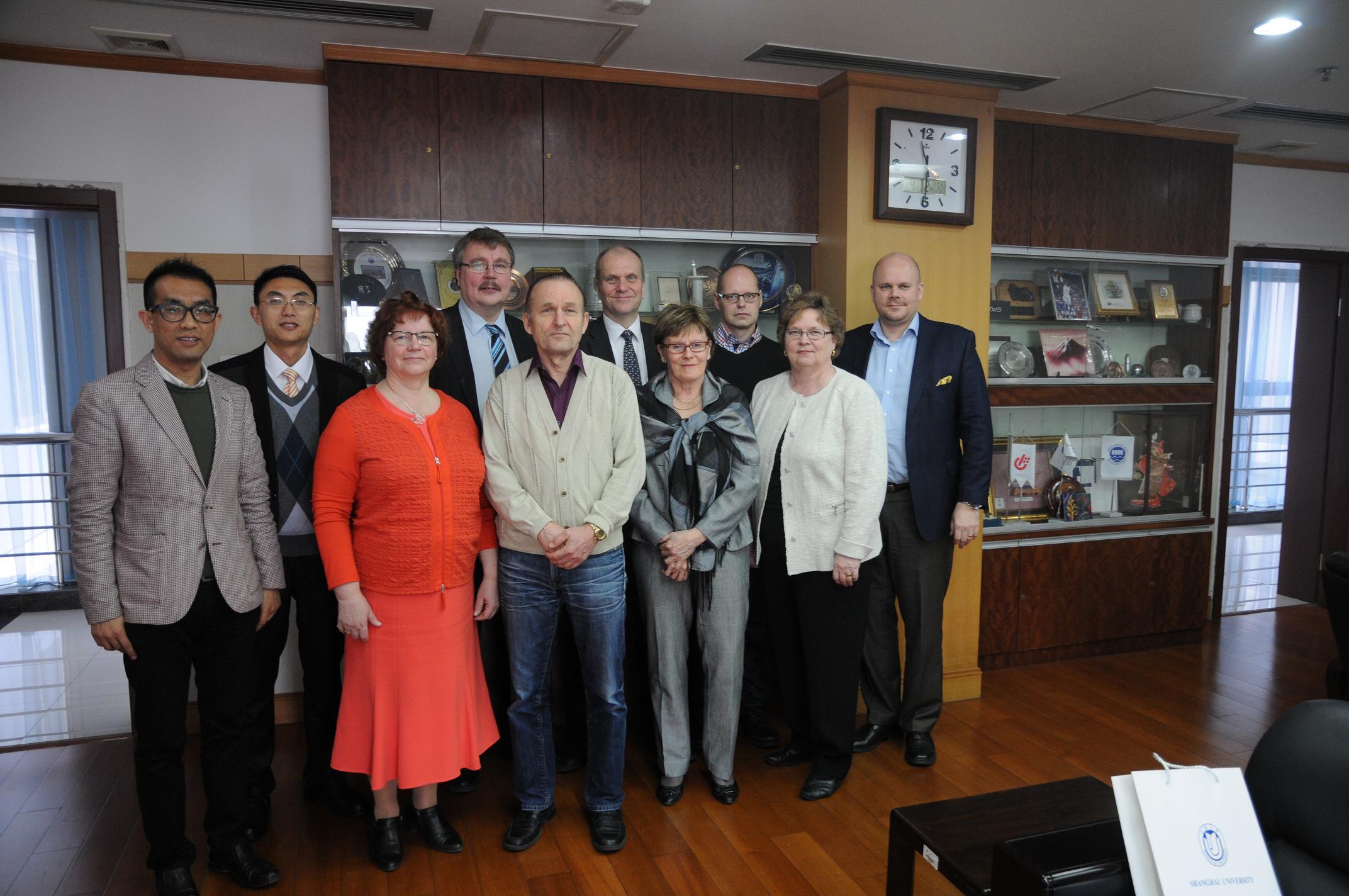 校园参观后,国际事务处万旺根处长在行政楼203接待了代表团一行并主持了会议。万处长首先对代表团的到来表示热烈欢迎。他说,埃斯波市与上海是友好城市,国际化是上海大学重点推进的发展战略,我们愿意在友好城市的基础上,互派学生,加强交往,希望此次交流能为双方合作打开一扇新的大门。Kaisu Tovionen女士在介绍了代表团人员后,回顾了埃斯波市与上海的交往历史并对上海大学优美的校园表示了赞美。万处长接着介绍了上海大学的总体情况。从校园历史、总体规划、办学理念、学术成果、国内综合排名、国际合作、中外合作办学等方面做了详尽的介绍。随后,代表团与校方人员就可能开展的合作事宜开展了自由交流。同时,国际交流学院的黄老师对学院的招生政策做了简单介绍。Mr. Erma对上海大学非常感兴趣。他详细询问了如何申请在上海大学就读的相关事宜。双方人员就入学条件、学生住宿、学分互换等事宜进行了热流交流。
