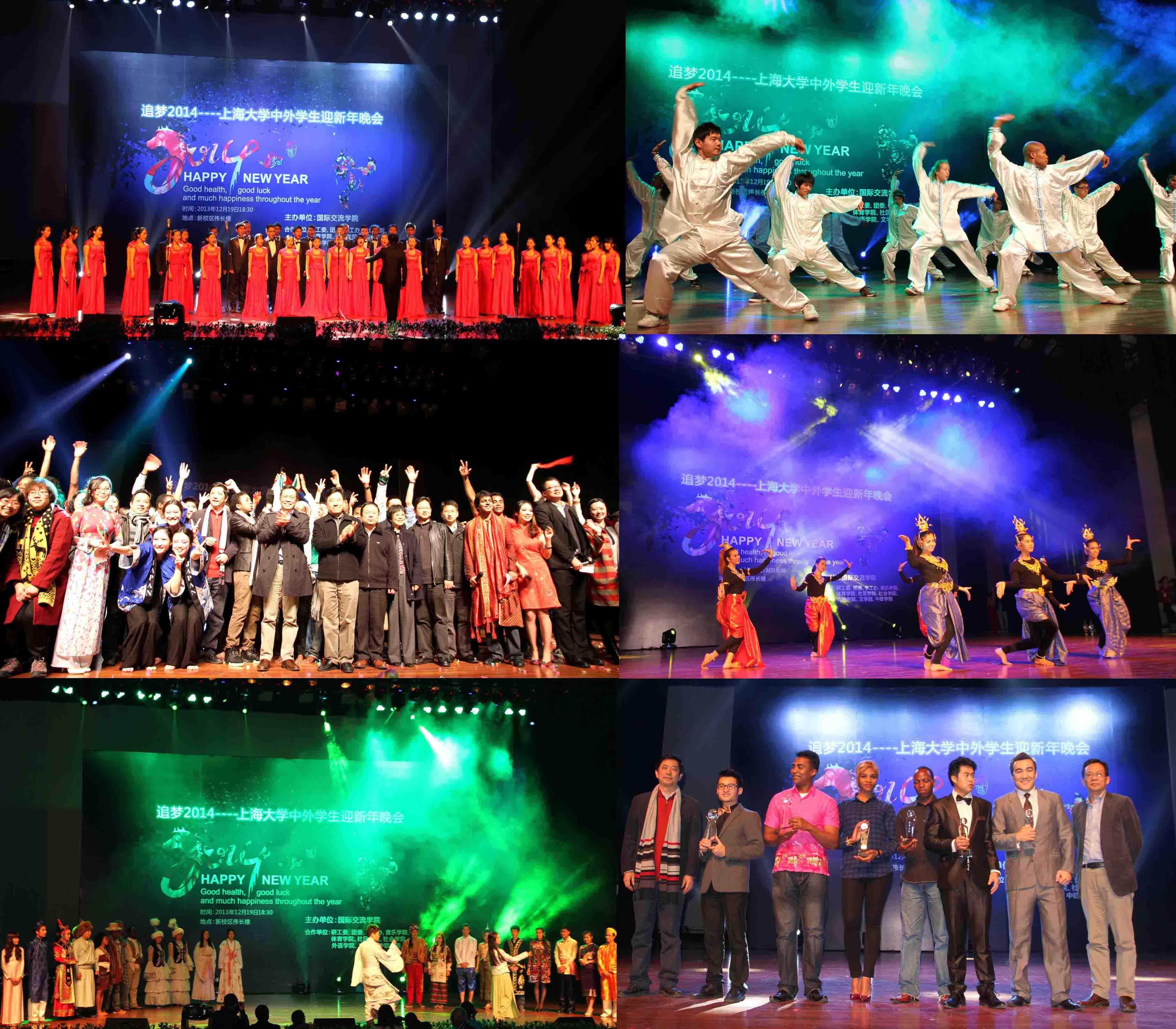 2013年12月19日晚18:30,上海大学校本部伟长楼座无虚席,1200多名中外学生欢聚一堂,来自留学生合唱团的一曲《喜欢上海的理由》拉开了“追梦2014——上海大学中外学生迎新年晚会”的序幕。晚会由上海大学国际交流学院主办,研工委、团委、学工办、音乐学院、体育学院、社区学院、社会学院、外语学院、文学院、中欧学院等多部门和学院合作,共同搭建了一个中外学生交流、融合、沟通、互动的大舞台,呈献出上海大学校园文化艺术的国际风采。校党委副书记鲁雄刚、副校长汪敏、校长助理李伟、学工办主任林海霞、国际交流学院院长姚喜明、院党总支书记李坚、副院长杨静、曾桂娥以及国际事务处副处长倪兰、教务处副处长贺英、外语学院副书记王国建、研工委副书记凌长臣、校团委副书记仇静豪等出席晚会。