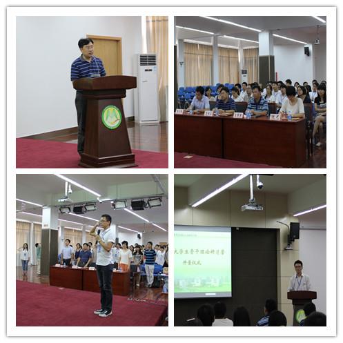 胡大伟老师就本期青马工程的总体情况向大家进行介绍,重点介绍了“青马微课堂”。“青马微课堂”是对去年团干部授课的丰富、优化和发展,它注重从学生骨干的需求出发,从学生骨干的困惑入手,通过小班教学、网络互动、在线交流等多种授课形式,延伸课堂教学,用学员们喜闻乐见的方式进行学习,让学员更加自主、便捷、个性化的分享课程资源。今年“青马微课堂” 根据在学员中开展的调研反馈,选取《学生组织中的心理学》、《学生组织中沟通与管理》、《演讲与口才》受欢迎程度最高的三门课程作为必修课程。同时新开设《学生干部的职业生涯规划》、《一名受欢迎的学生干部是如何炼成的》两门选修课供学员选择学习。王军华老师点击激光笔,启动了“青马微课堂”。沈艺老师将象征青马工程的营旗授予第六期“青马”学员代表。