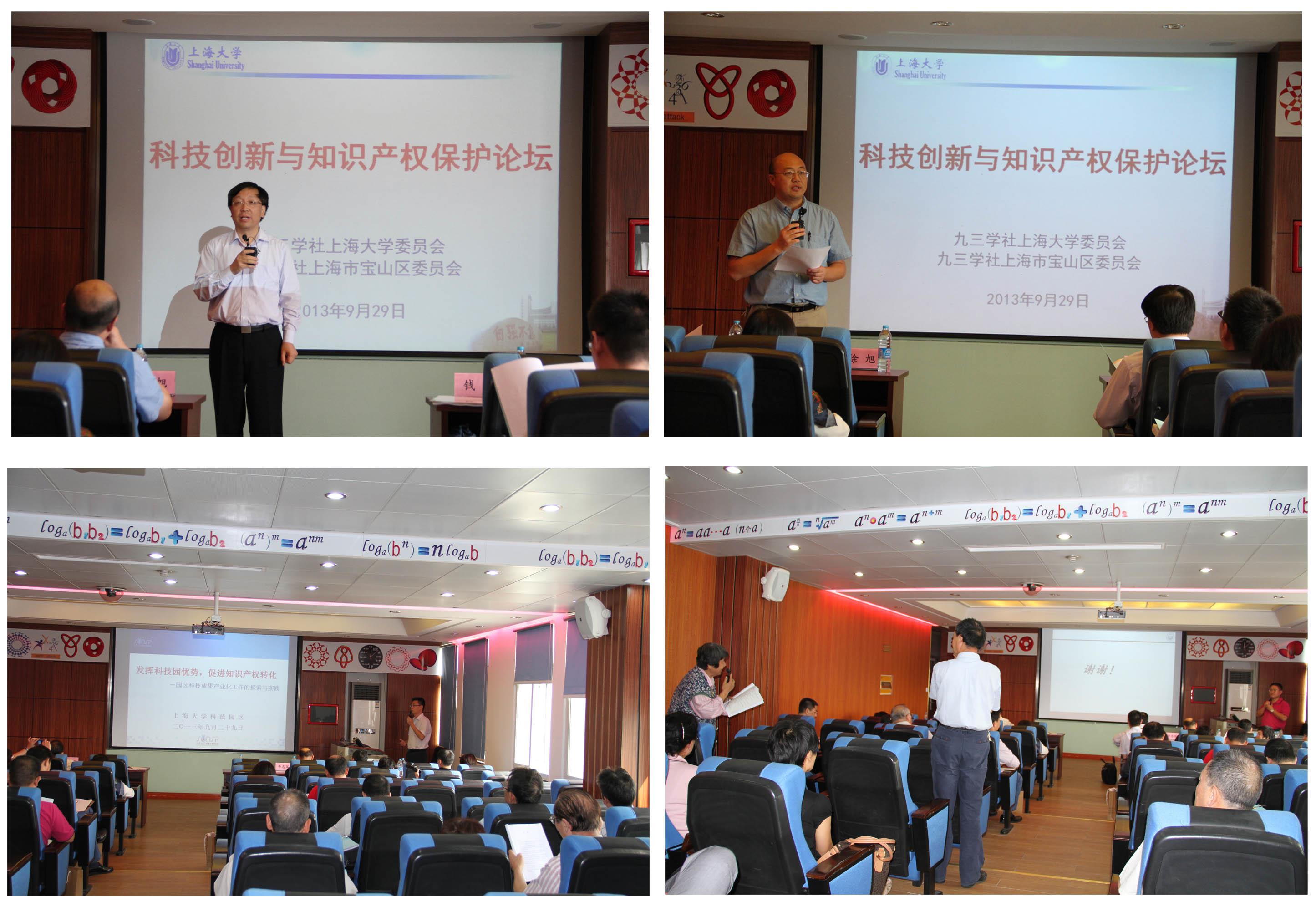 9月29日下午,九三学社2013年“科技创新与知识产权保护论坛”在我校宝山校区成功举办。九三学社上海市委员会副主委、华东理工大学副校长钱锋出席论坛并应邀为论坛做主题报告。上海大学党委常委、校长助理、组织部部长徐旭到会致辞,宝山区委统战部、宝山区科委和淞南镇的相关领导也出席了论坛。来自宝山区、市部分大专院校、科技园区、企业、政府机构和我校的专家学者等近80名代表参加了论坛。论坛围绕“科技创新与知识产权保护”这一主题开展。